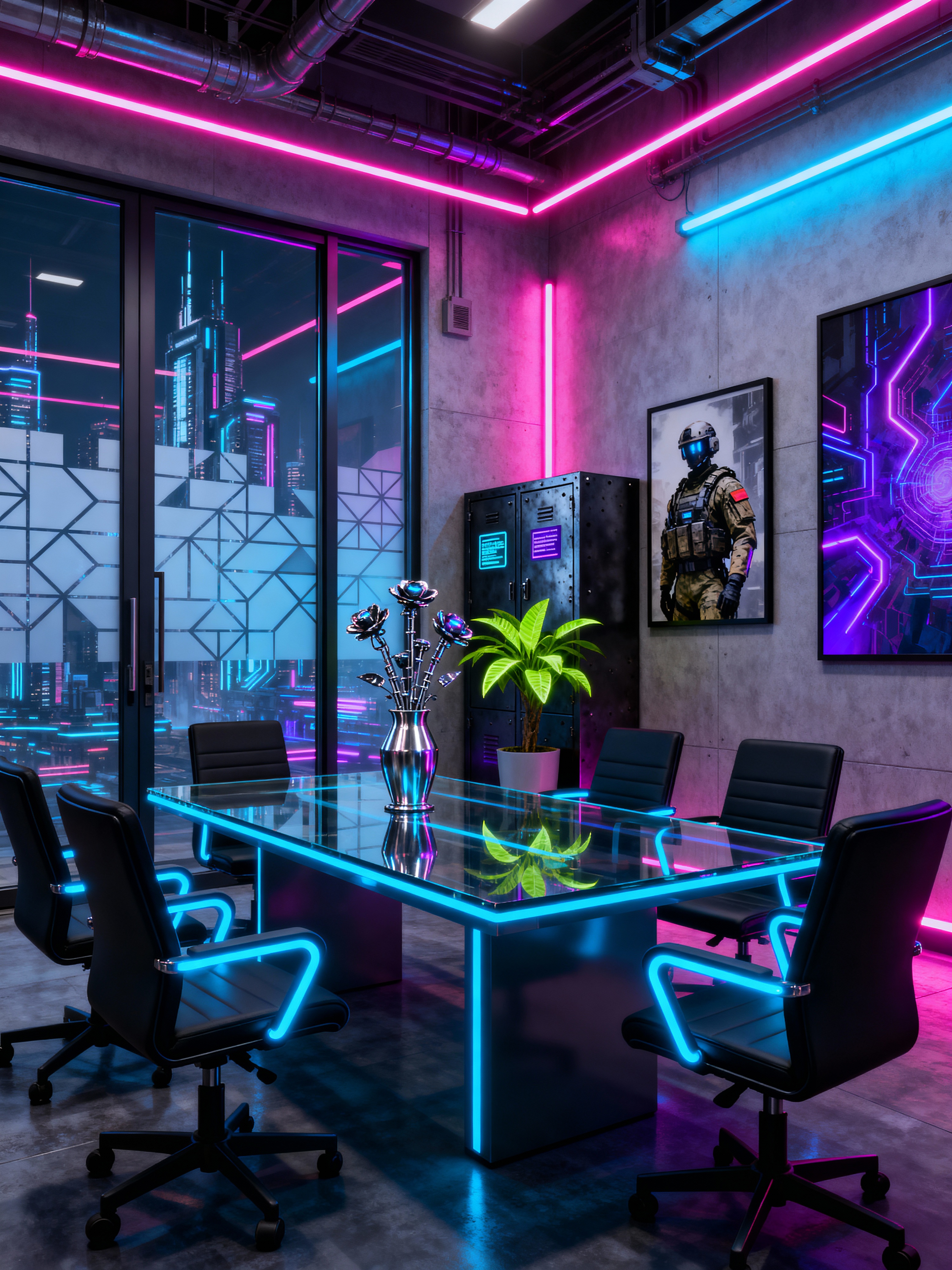 meeting room with cyberpunk style with vase and office chairs and cabinets and glass doors and boardroom table and glass walls and plant and painting or photo on wall. . with military uniforms and gear and futuristic cybernetic city and bladerunner lights and color lights glow and bladerunner style and cyberpunk style and strong geometric walls and led lights