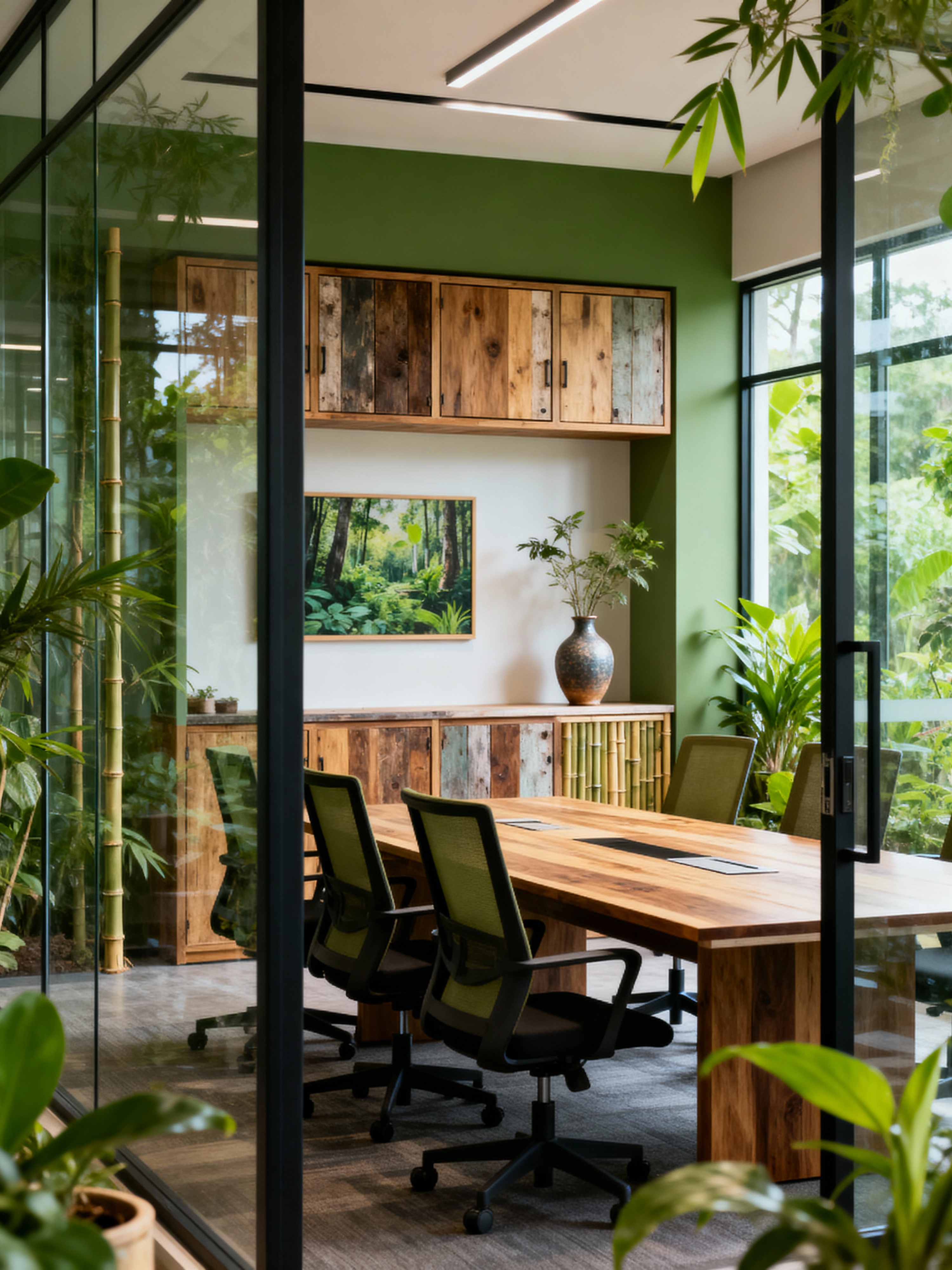 meeting room with eco-friendly style with cabinets and office chairs and boardroom table and vase and painting or photo on wall and plant and glass walls and glass doors. . with green living and recycled elements and reclaimed wood and organic textiles and natural fibers and bamboo furniture and non-toxic finishes and renewable resources