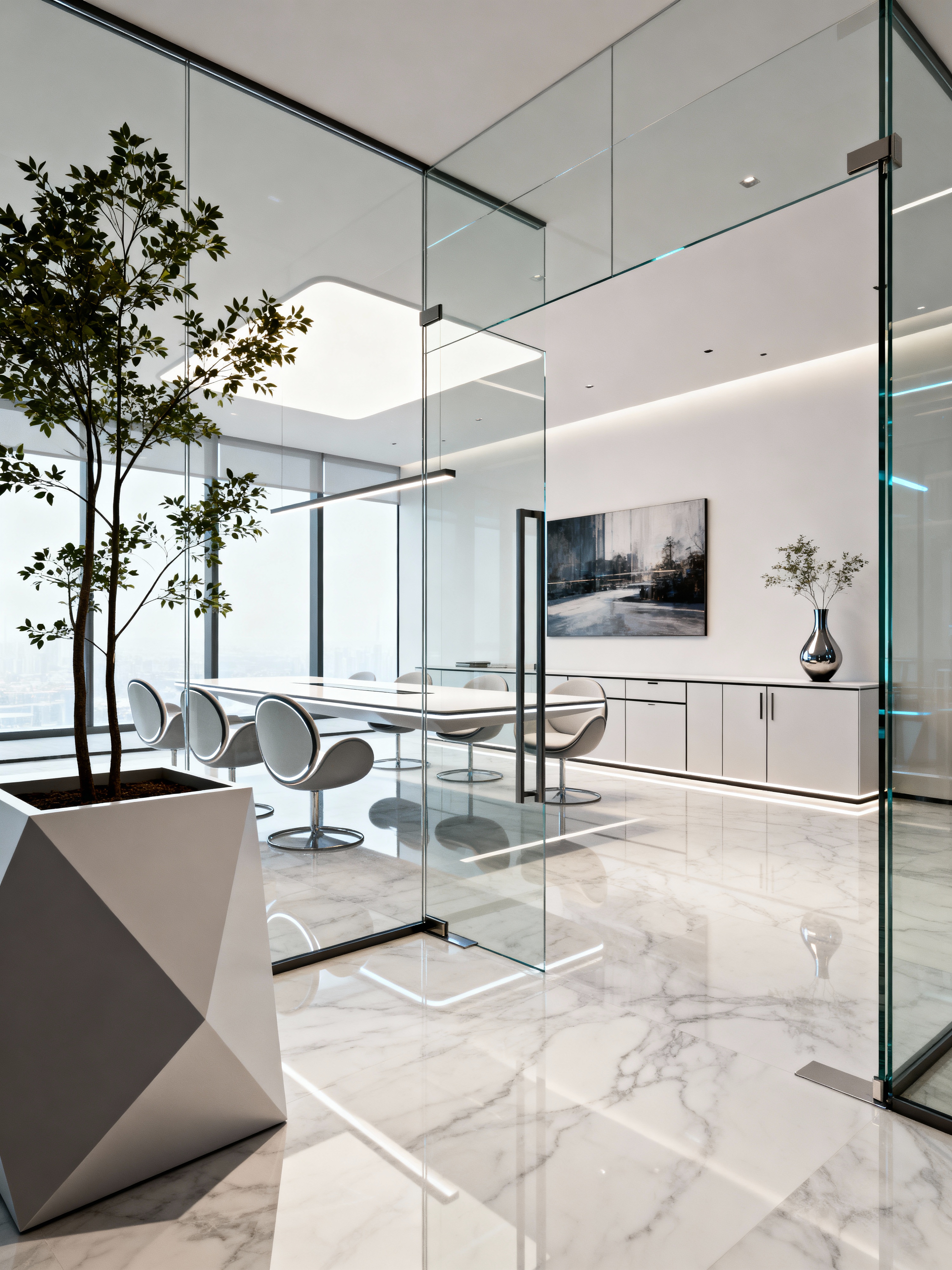 meeting room with futuristic style with plant and cabinets and vase and office chairs and glass walls and glass doors and boardroom table and painting or photo on wall. . with minimalist clean lines and glass panes and light colors and floating surfaces and circular shapes and smooth polished marble and futuristic interior and futurism
