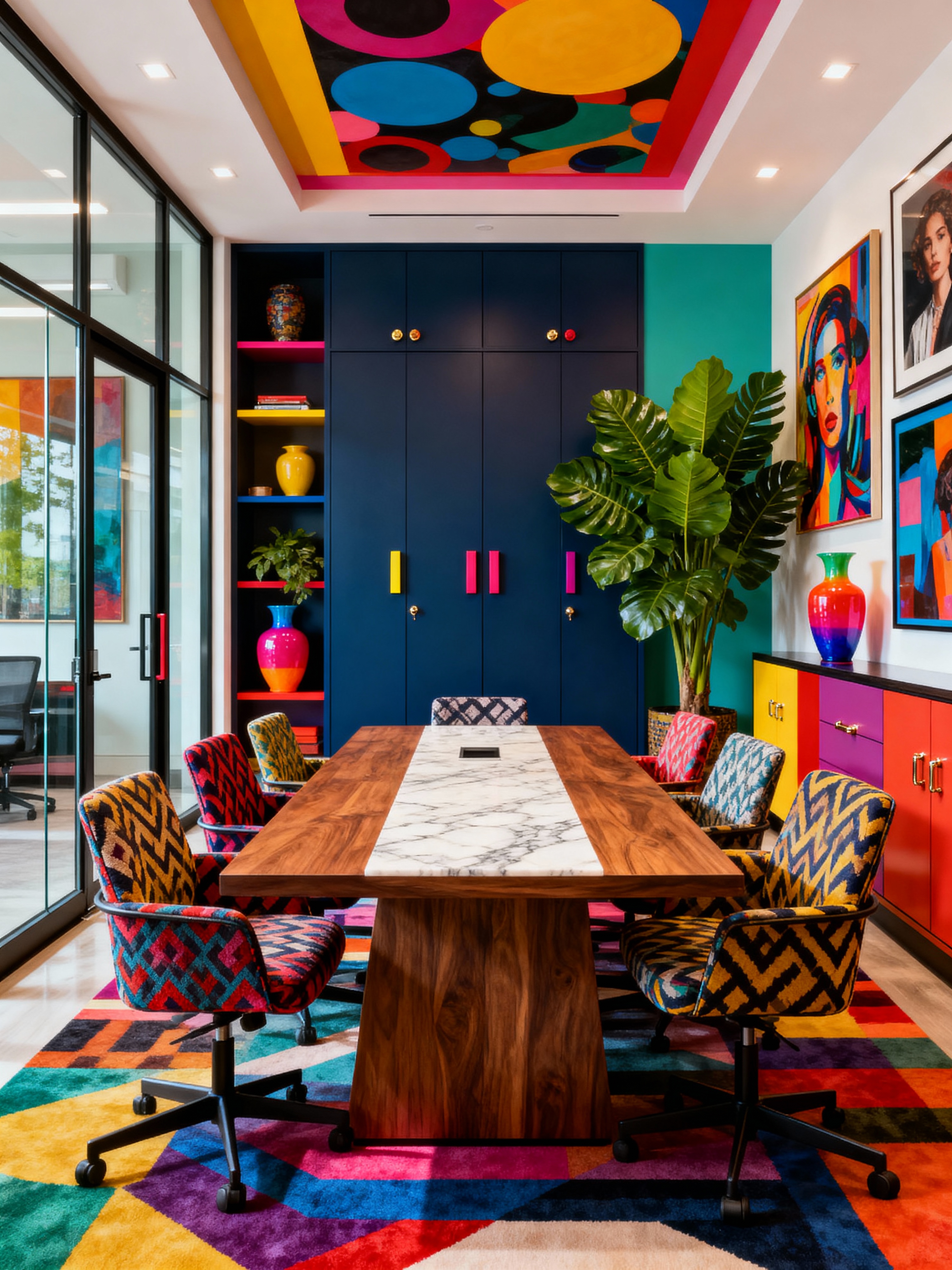 meeting room with maximalist style with glass doors and plant and boardroom table and painting or photo on wall and office chairs and cabinets and vase and glass walls. . with vibrant and bold creativity and more is more philosophy and bold colors and bold patterns and bold design and playful and eye-catching