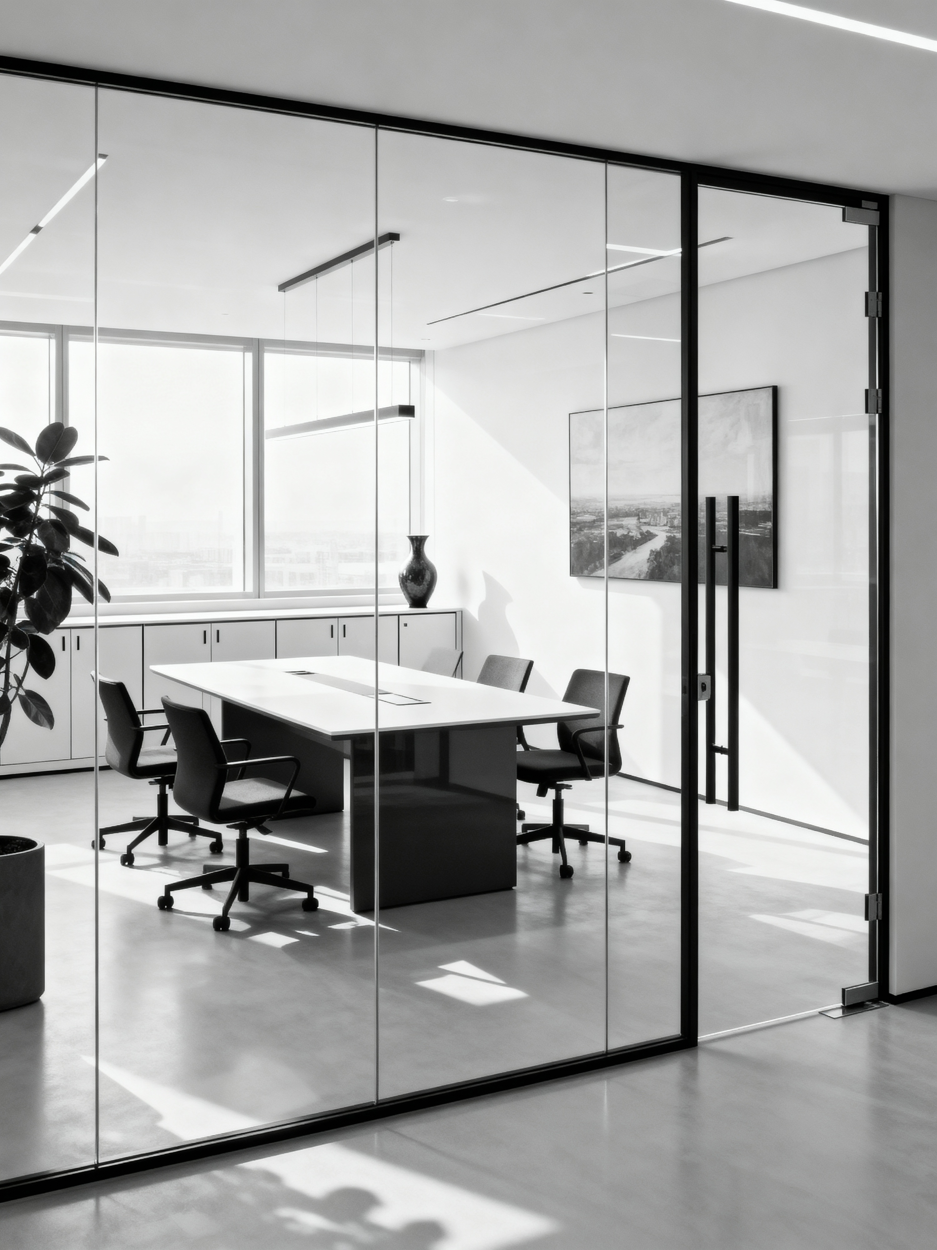 meeting room with minimalist style with glass walls and plant and boardroom table and vase and glass doors and painting or photo on wall and cabinets and office chairs. . with functional furniture and clean lines and a monochromatic palette with colour used as an accent and focus on the shape, colour and texture of just a few of essential elements and an open floor plan and lots of light and functional furniture