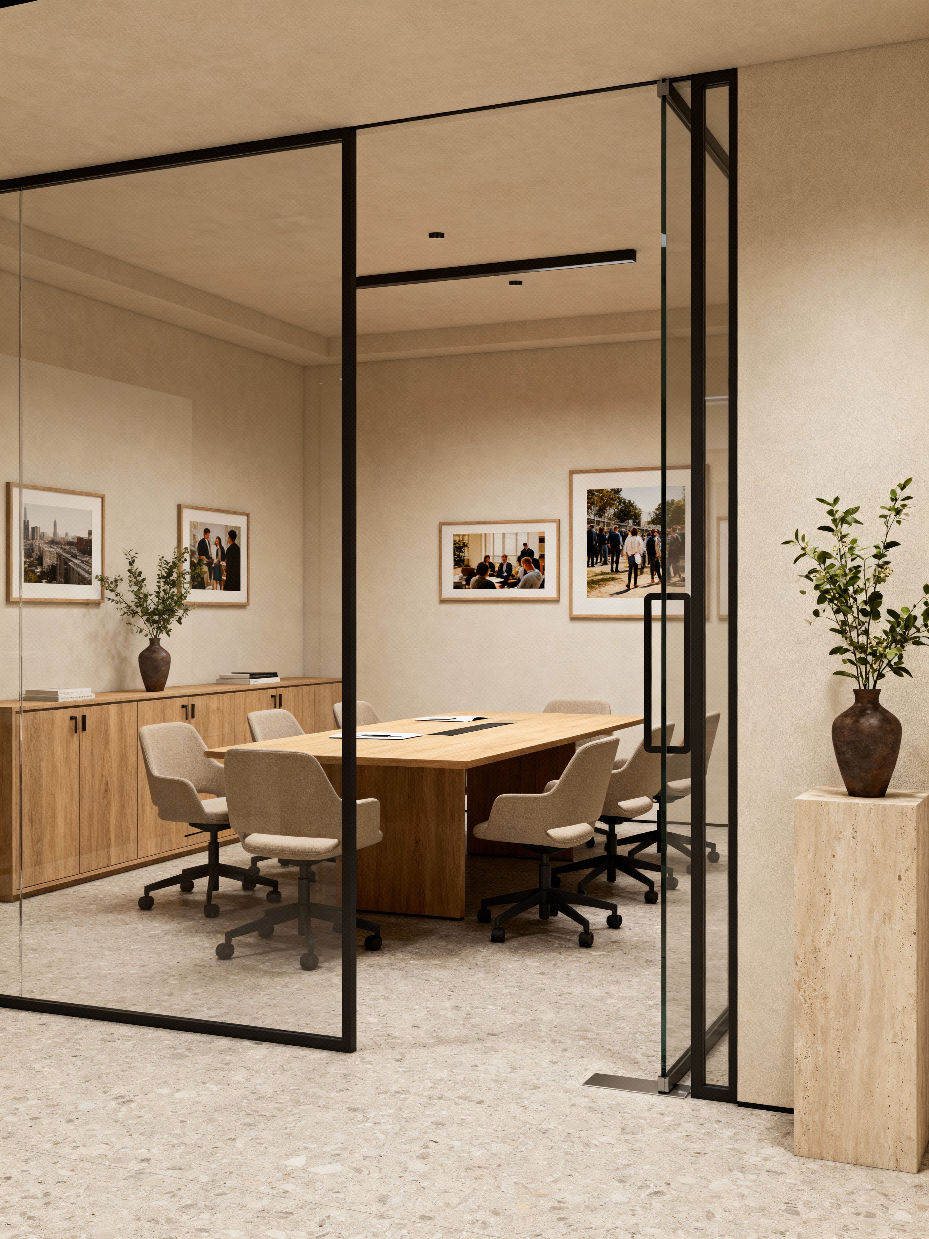 meeting room with modern style with glass walls and painting or photo on wall and plant and vase and cabinets and boardroom table and glass doors and office chairs. . with practicality and functionality and neutral walls and textures and open and natural lighting and natural materials and elements and simple, clean lines and simplistic furniture and practicality and functionality