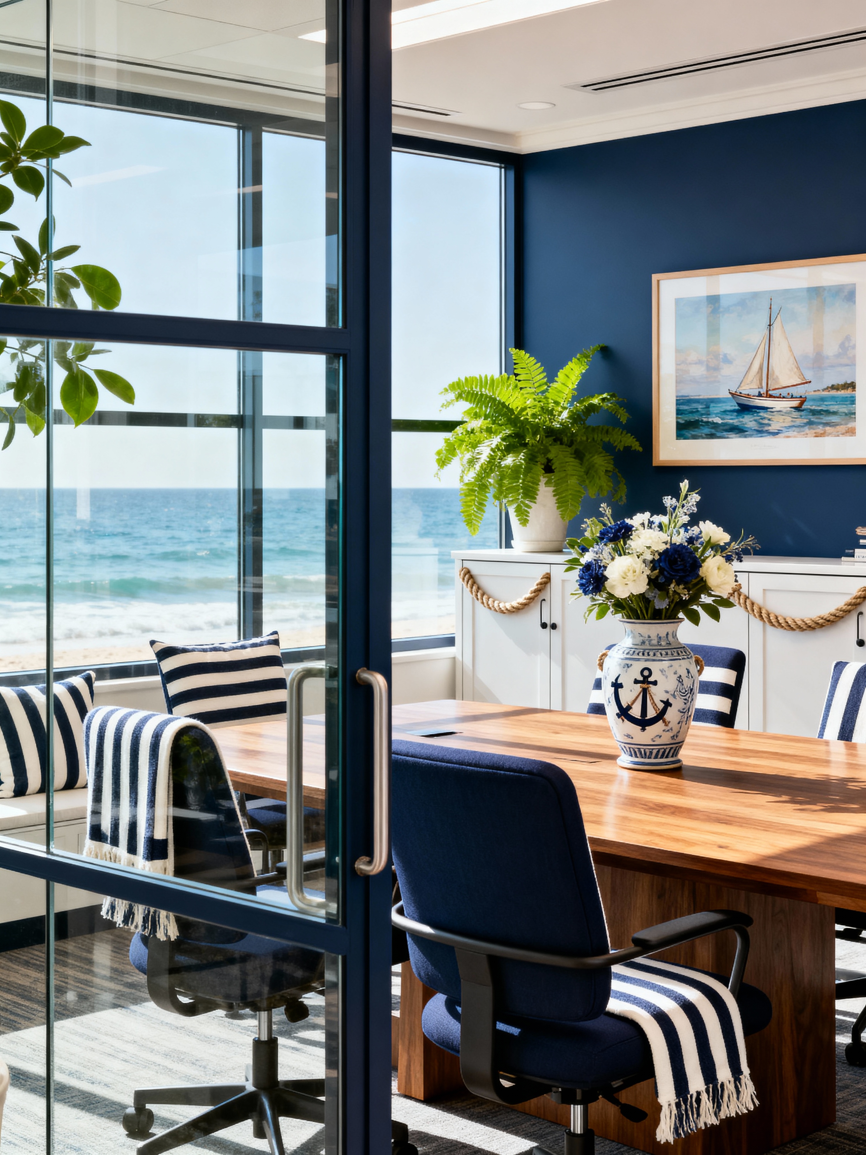meeting room with nautical style with glass doors and office chairs and cabinets and glass walls and vase and painting or photo on wall and plant and boardroom table. . with ocean inspiration and seaside charm and striped patterns and rope details and coastal vibes and maritime decor and sailboat elements and navy blue