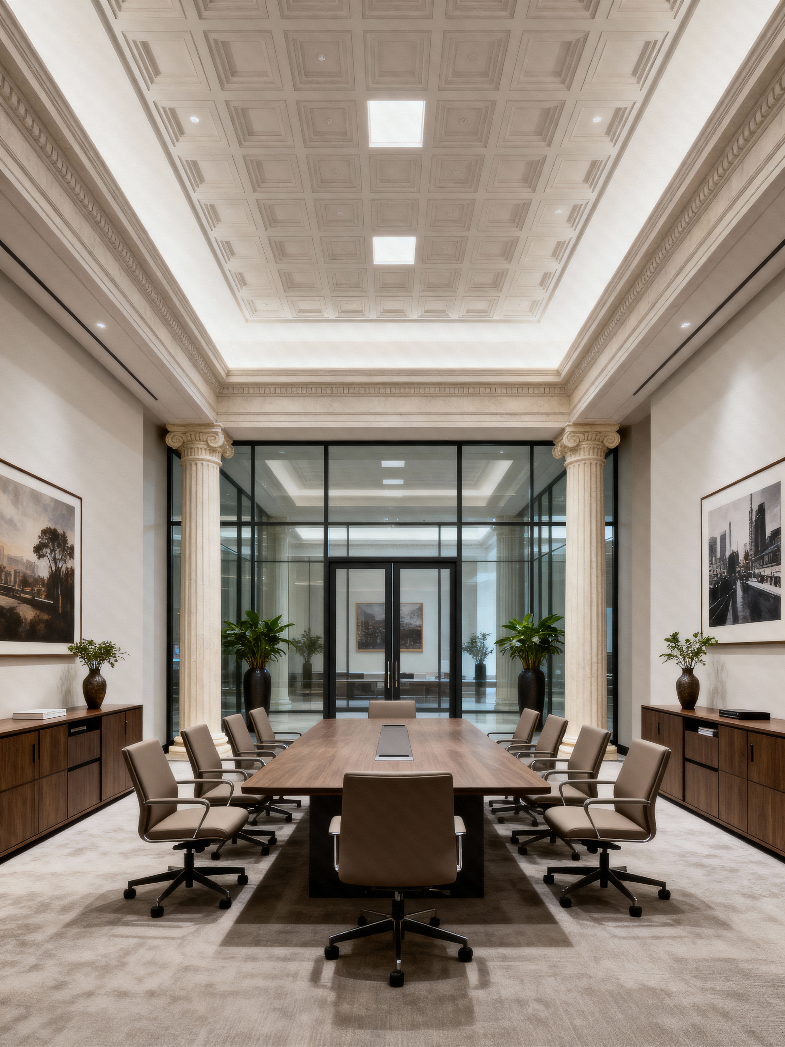 meeting room with neoclassic style with office chairs and boardroom table and painting or photo on wall and plant and vase and cabinets and glass doors and glass walls. . with elegant and sophisticated and geometric decorative elements and thoughtful minimalism and spacious rooms and greek columns and symmetric layouts and high ceilings and timeless artwork
