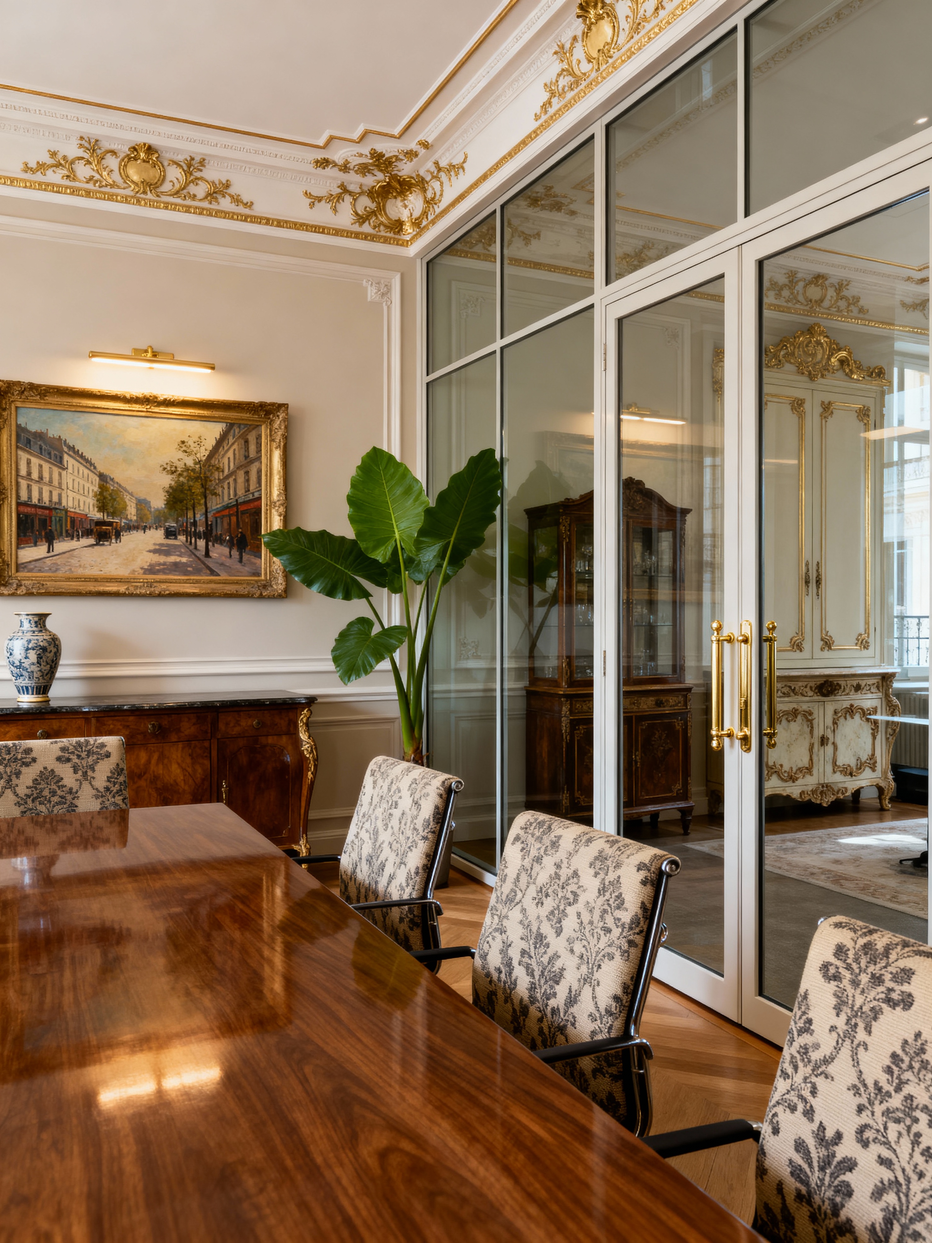 meeting room with parisian style with vase and boardroom table and glass walls and office chairs and painting or photo on wall and cabinets and glass doors and plant. . with ornate moldings and antique furniture and french elegance and refined style and classic details and sophisticated charm and chic simplicity and vintage pieces