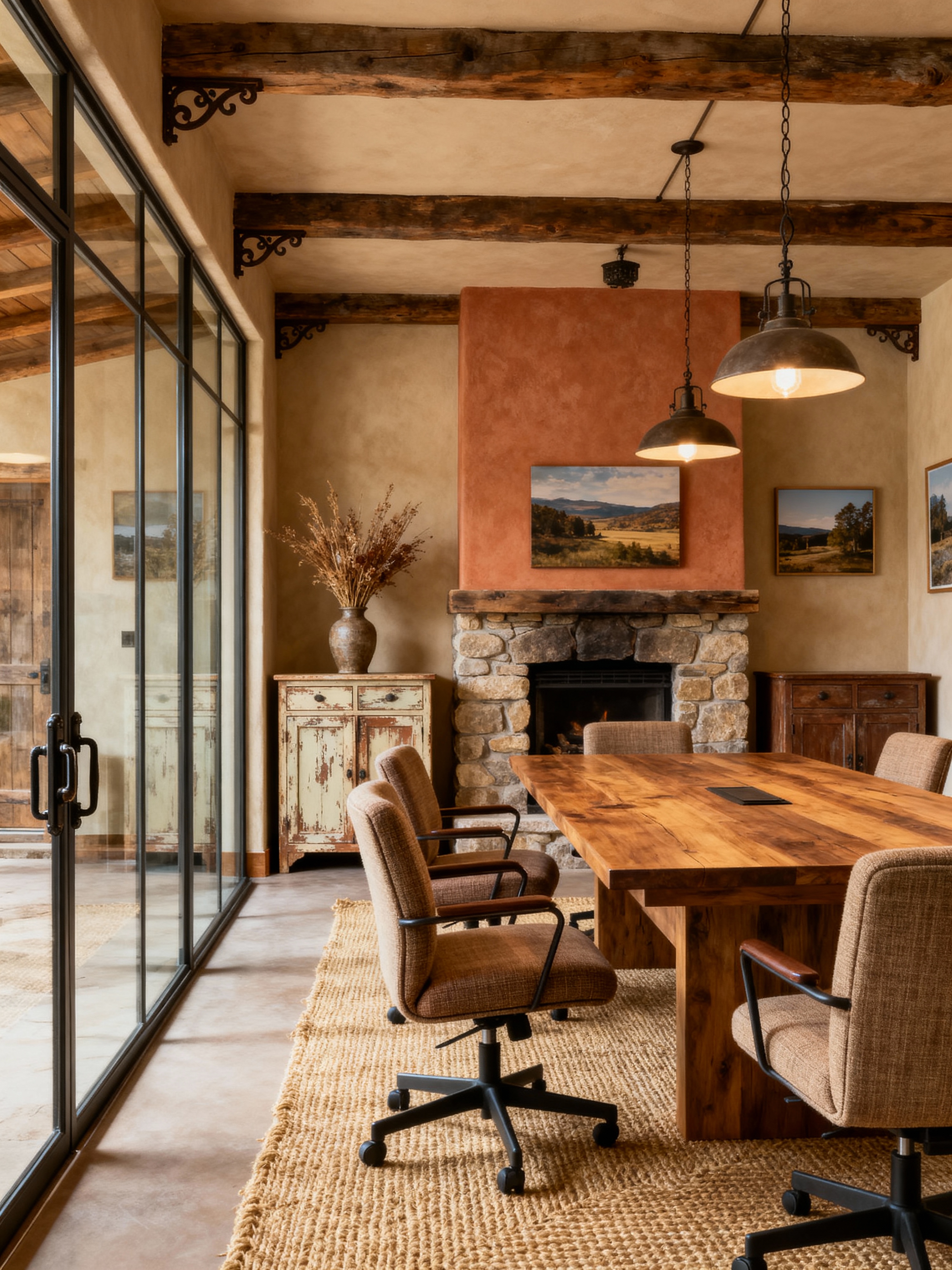 meeting room with rustic style with plant and glass walls and office chairs and painting or photo on wall and glass doors and cabinets and vase and boardroom table. . with earthy tones and woven textures and stone accents and warmth and country style and iron fixtures and cozy cabin and exposed beams