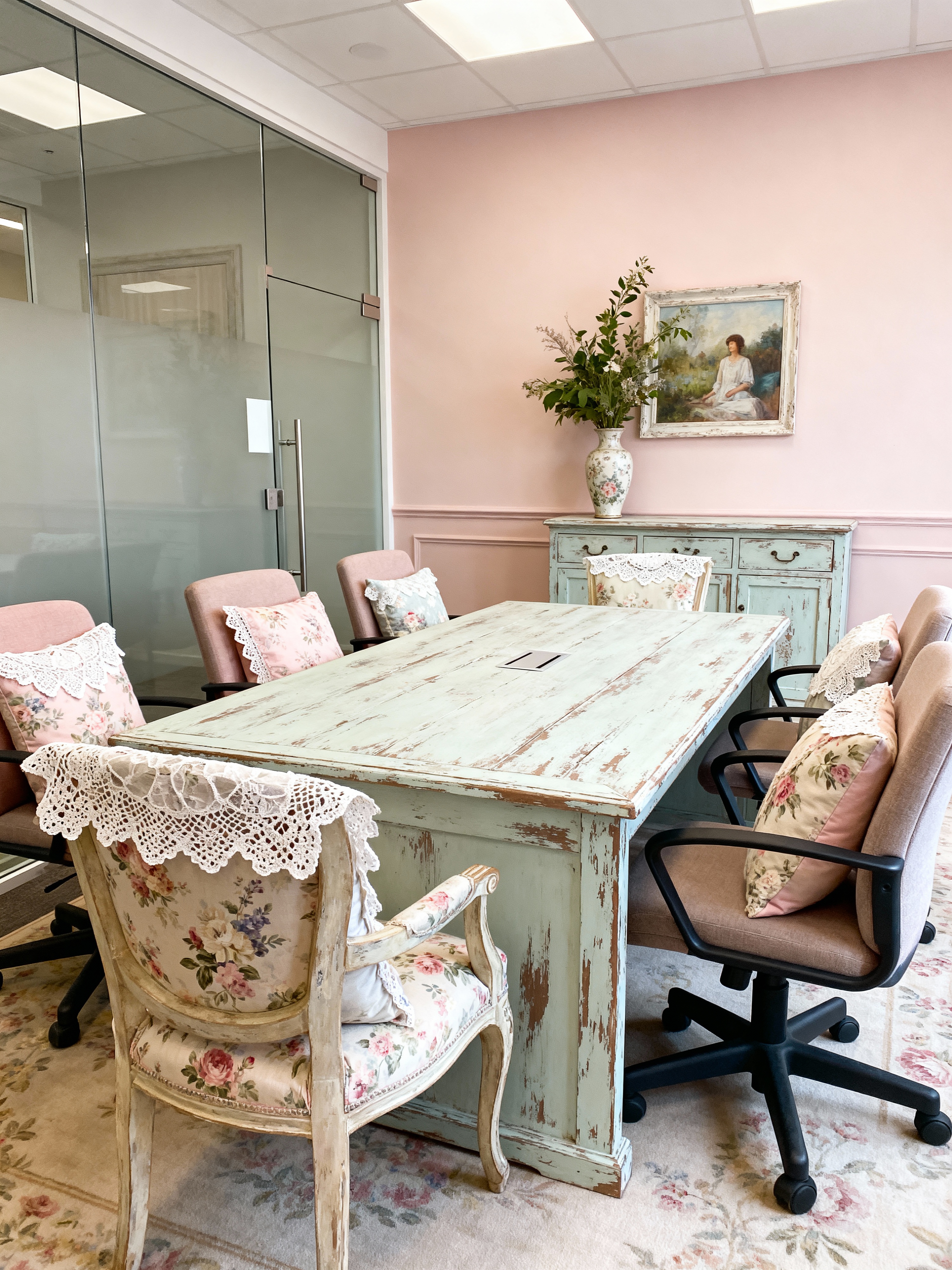 meeting room with shabby chic style with vase and plant and glass walls and glass doors and office chairs and cabinets and painting or photo on wall and boardroom table. . with cottage feel and floral patterns and feminine touches and delicate details and distressed furniture and romantic style and antique lace and pastel colors