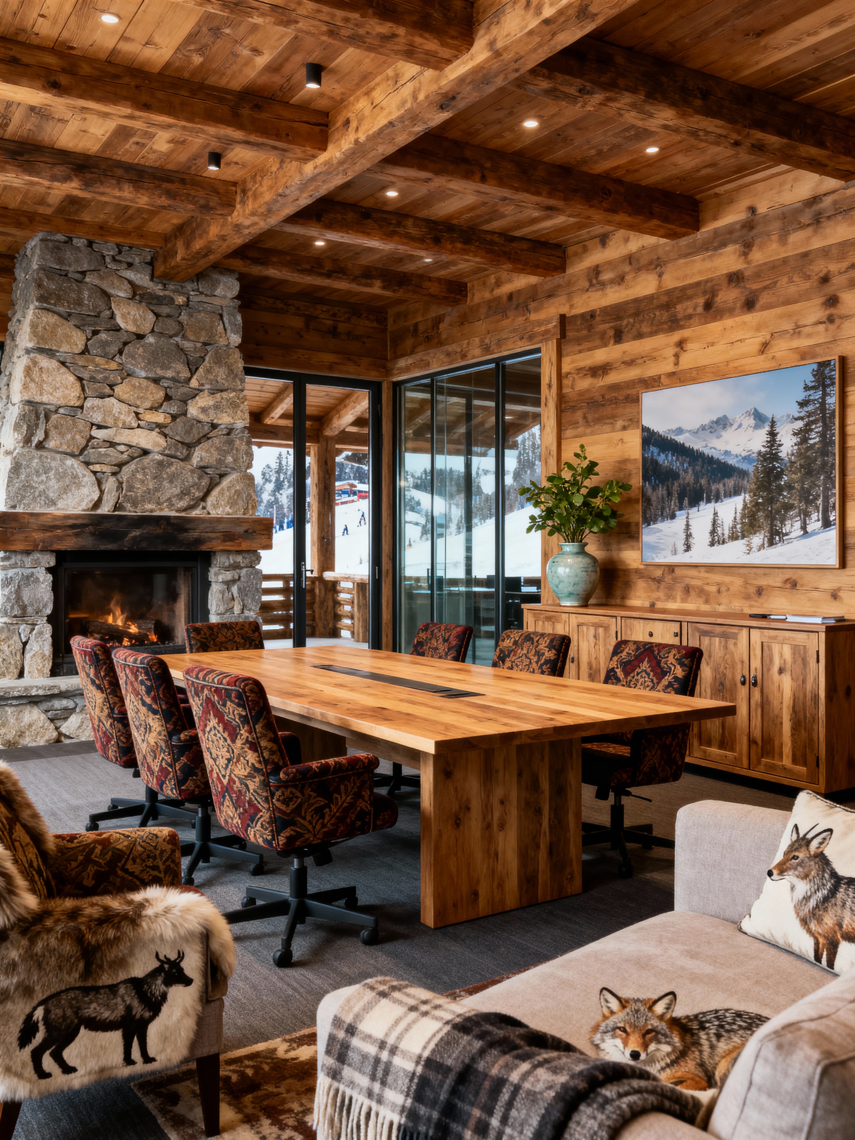 meeting room with ski chalet style with cabinets and boardroom table and glass doors and plant and vase and painting or photo on wall and office chairs and glass walls. . with exposed timber and richly patterned fabrics and wooden walls and stone fireplace and nature-inspired and wood beams and animal motifs and layered textiles