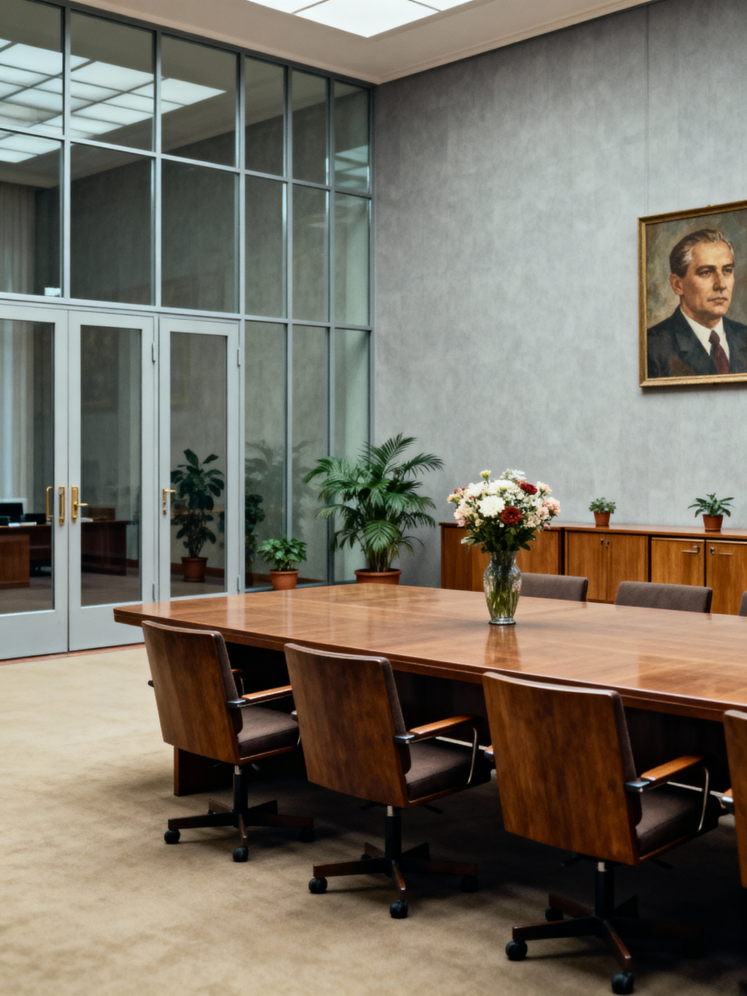 meeting room with soviet style with vase and cabinets and boardroom table and glass doors and plant and painting or photo on wall and office chairs and glass walls. . with eastern bloc and soviet-era architecture and socialist realism and functional furniture and monumental scale and communist design and institutional look and austere aesthetic