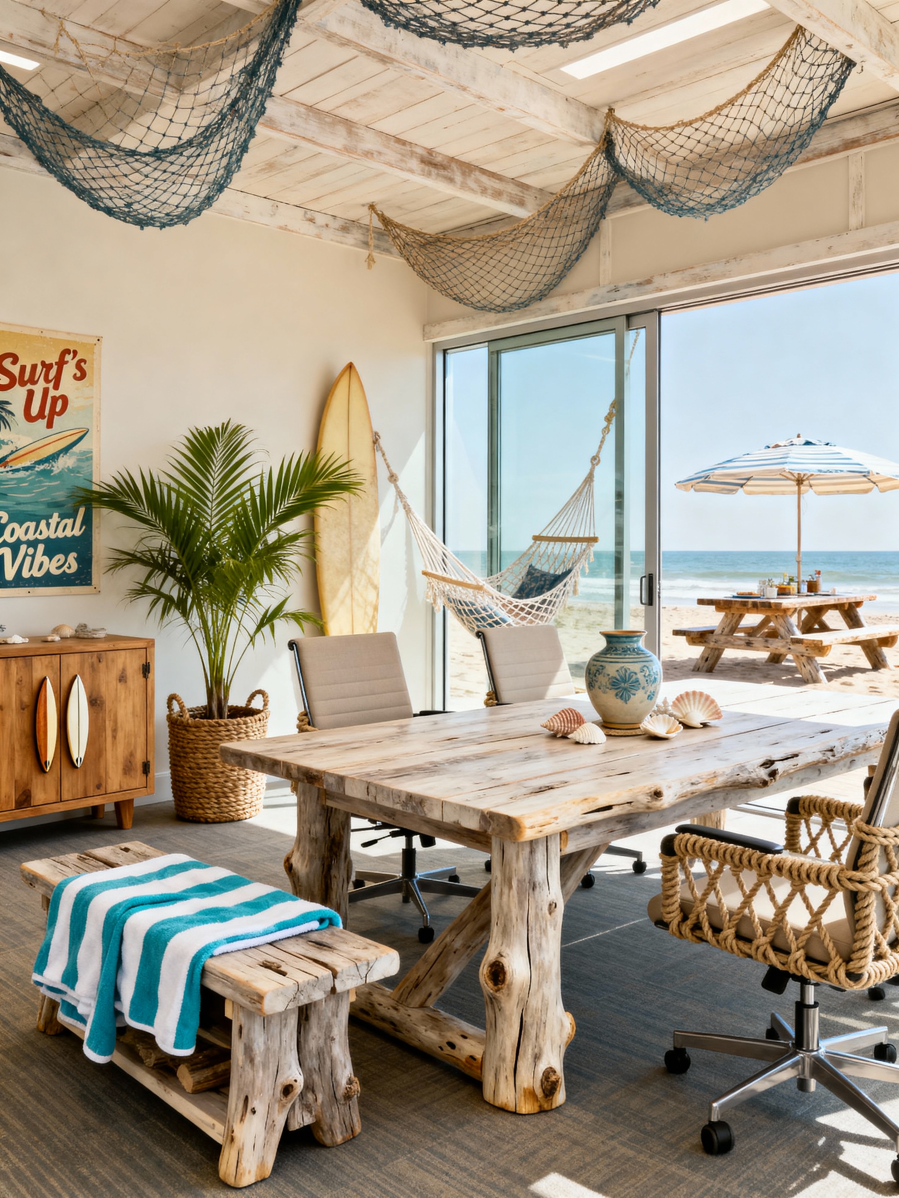 meeting room with surf shack style with glass doors and boardroom table and painting or photo on wall and office chairs and cabinets and plant and glass walls and vase. . with driftwood furniture and beach towels and hammocks and net decorations and casual dining and vintage surf posters and sun-bleached wood and beach umbrellas