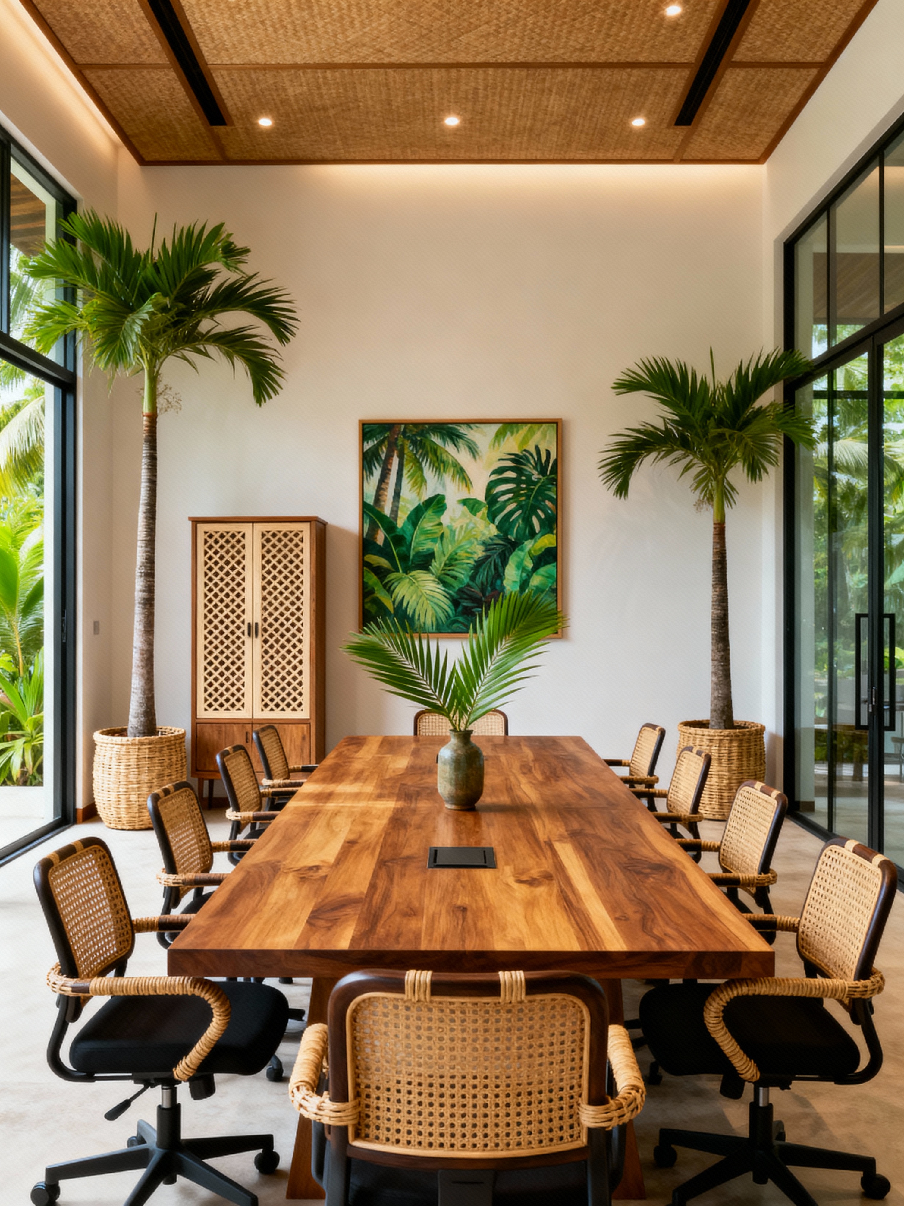 meeting room with tropical style with office chairs and cabinets and painting or photo on wall and plant and vase and glass walls and glass doors and boardroom table. . with palm trees and teak and lattice prints and rattan and palm leaves and bamboo and cane motifs and wicker