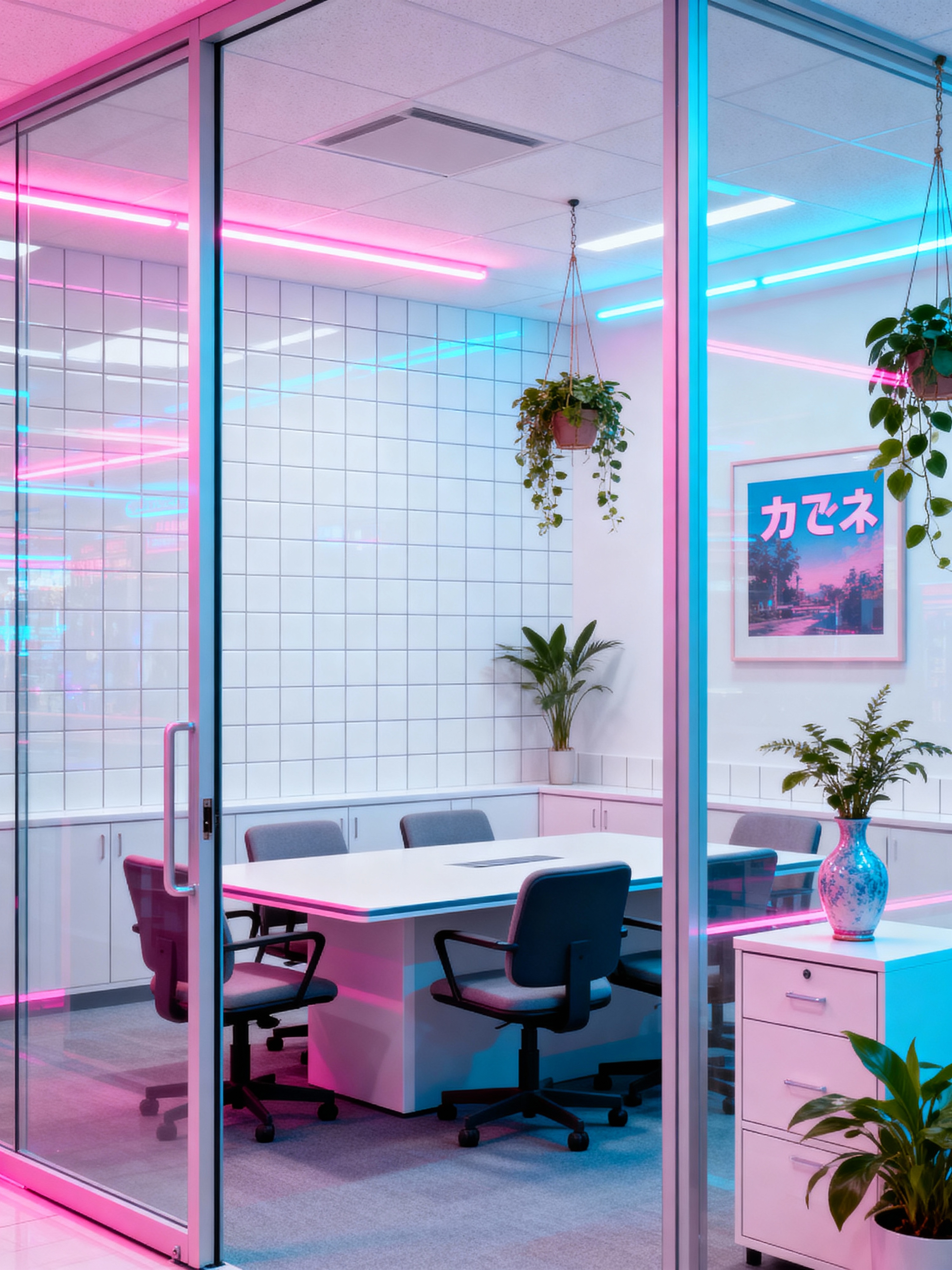 meeting room with vaporwave style with glass doors and vase and boardroom table and plant and office chairs and glass walls and cabinets and painting or photo on wall. . with 1980s retail shops and japanese letters on wall and white square bath tiles and hanging plants and bright pink and baby blue and white square bath tiles and washed out colors