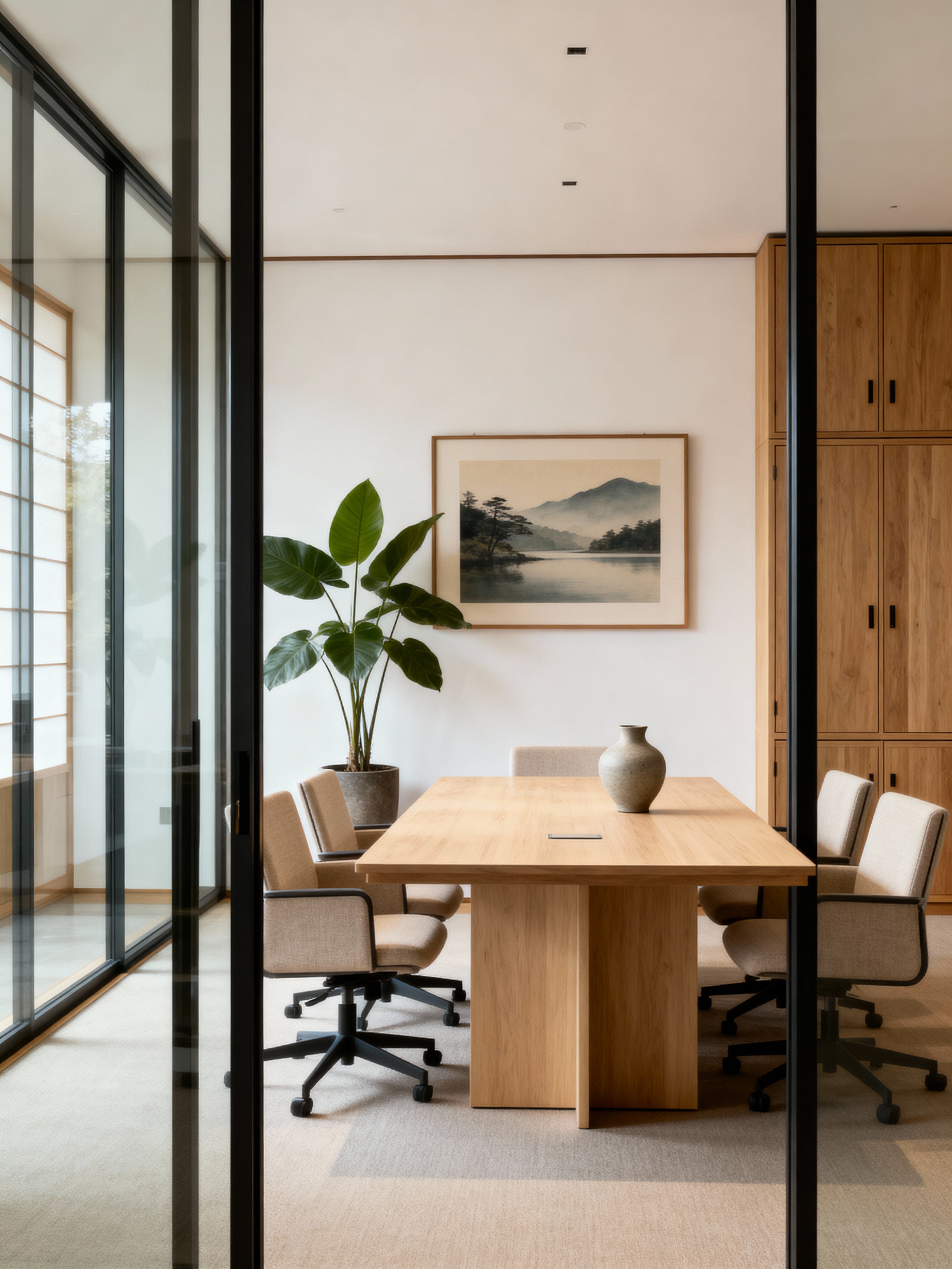 meeting room with zen style with glass doors and boardroom table and cabinets and plant and painting or photo on wall and glass walls and vase and office chairs. . with japanese minimalist interior and clean lines and asian zen interior and japanese minimalist interior and natural light and japanese interior and serenity and harmony and natural textures