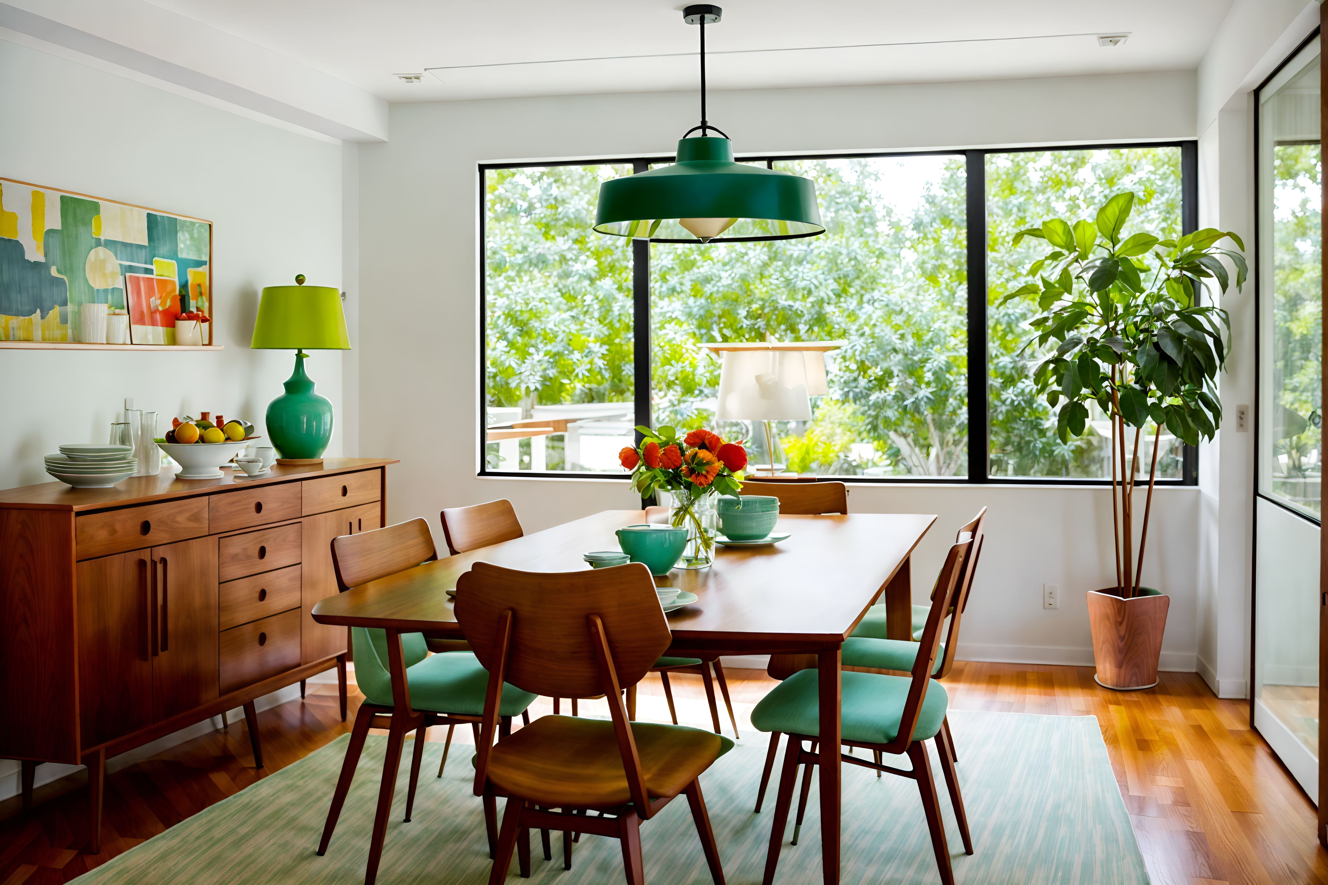 photo from pinterest of midcentury modern-style interior designed (dining room interior) with bookshelves and table cloth and vase and dining table chairs and dining table and plant and plates, cutlery and glasses on dining table and painting or photo on wall. . with integrating indoor and outdoor motifs and clean lines and muted tones and vibrant colors and minimalist and function over form and wood pendant light mid century modern chandelier and nature indoors. . cinematic photo, highly detailed, cinematic lighting, ultra-detailed, ultrarealistic, photorealism, 8k. trending on pinterest. midcentury modern interior design style. masterpiece, cinematic light, ultrarealistic+, photorealistic+, 8k, raw photo, realistic, sharp focus on eyes, (symmetrical eyes), (intact eyes), hyperrealistic, highest quality, best quality, , highly detailed, masterpiece, best quality, extremely detailed 8k wallpaper, masterpiece, best quality, ultra-detailed, best shadow, detailed background, detailed face, detailed eyes, high contrast, best illumination, detailed face, dulux, caustic, dynamic angle, detailed glow. dramatic lighting. highly detailed, insanely detailed hair, symmetrical, intricate details, professionally retouched, 8k high definition. strong bokeh. award winning photo.