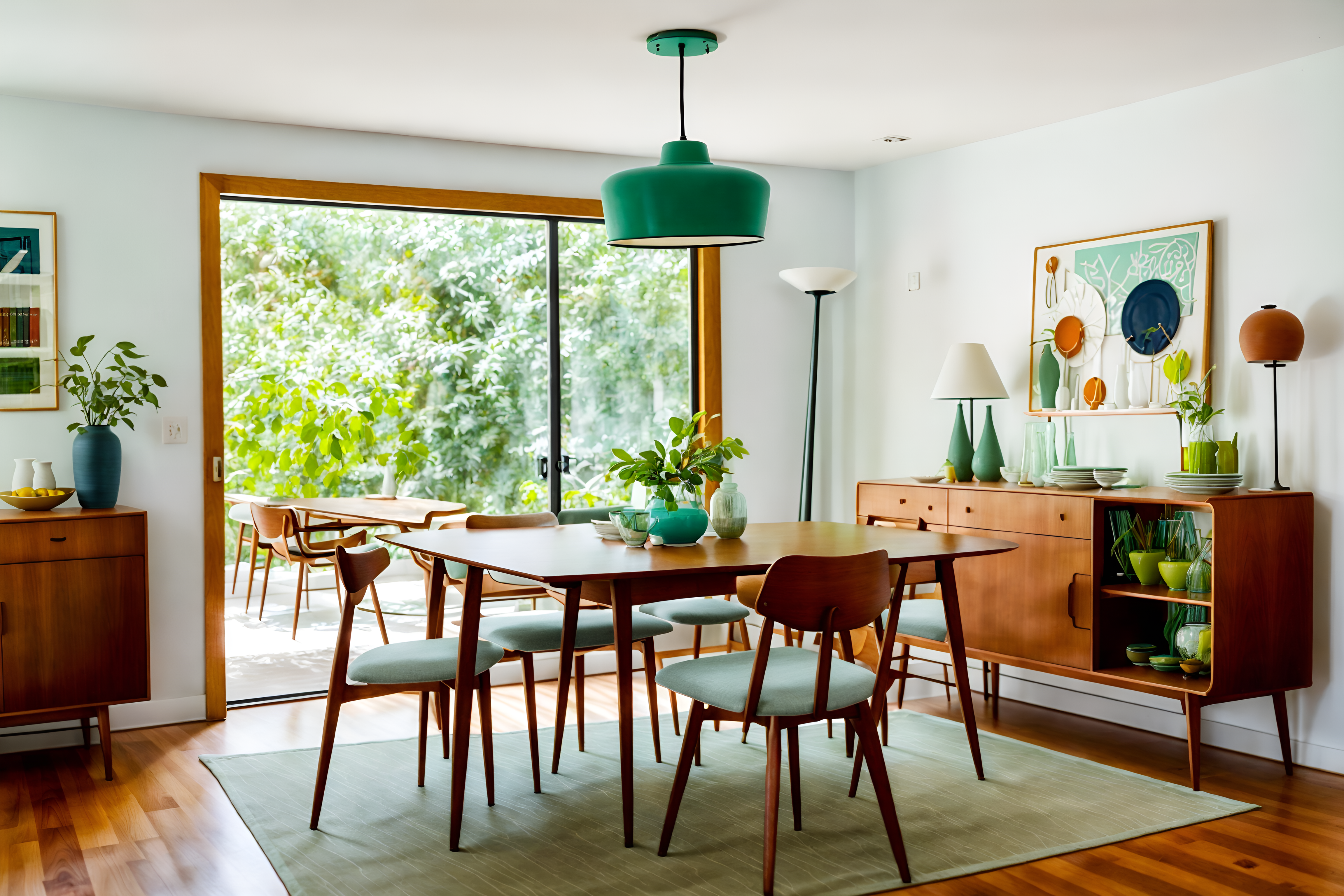 photo from pinterest of midcentury modern-style interior designed (dining room interior) with bookshelves and table cloth and vase and dining table chairs and dining table and plant and plates, cutlery and glasses on dining table and painting or photo on wall. . with integrating indoor and outdoor motifs and clean lines and muted tones and vibrant colors and minimalist and function over form and wood pendant light mid century modern chandelier and nature indoors. . cinematic photo, highly detailed, cinematic lighting, ultra-detailed, ultrarealistic, photorealism, 8k. trending on pinterest. midcentury modern interior design style. masterpiece, cinematic light, ultrarealistic+, photorealistic+, 8k, raw photo, realistic, sharp focus on eyes, (symmetrical eyes), (intact eyes), hyperrealistic, highest quality, best quality, , highly detailed, masterpiece, best quality, extremely detailed 8k wallpaper, masterpiece, best quality, ultra-detailed, best shadow, detailed background, detailed face, detailed eyes, high contrast, best illumination, detailed face, dulux, caustic, dynamic angle, detailed glow. dramatic lighting. highly detailed, insanely detailed hair, symmetrical, intricate details, professionally retouched, 8k high definition. strong bokeh. award winning photo.