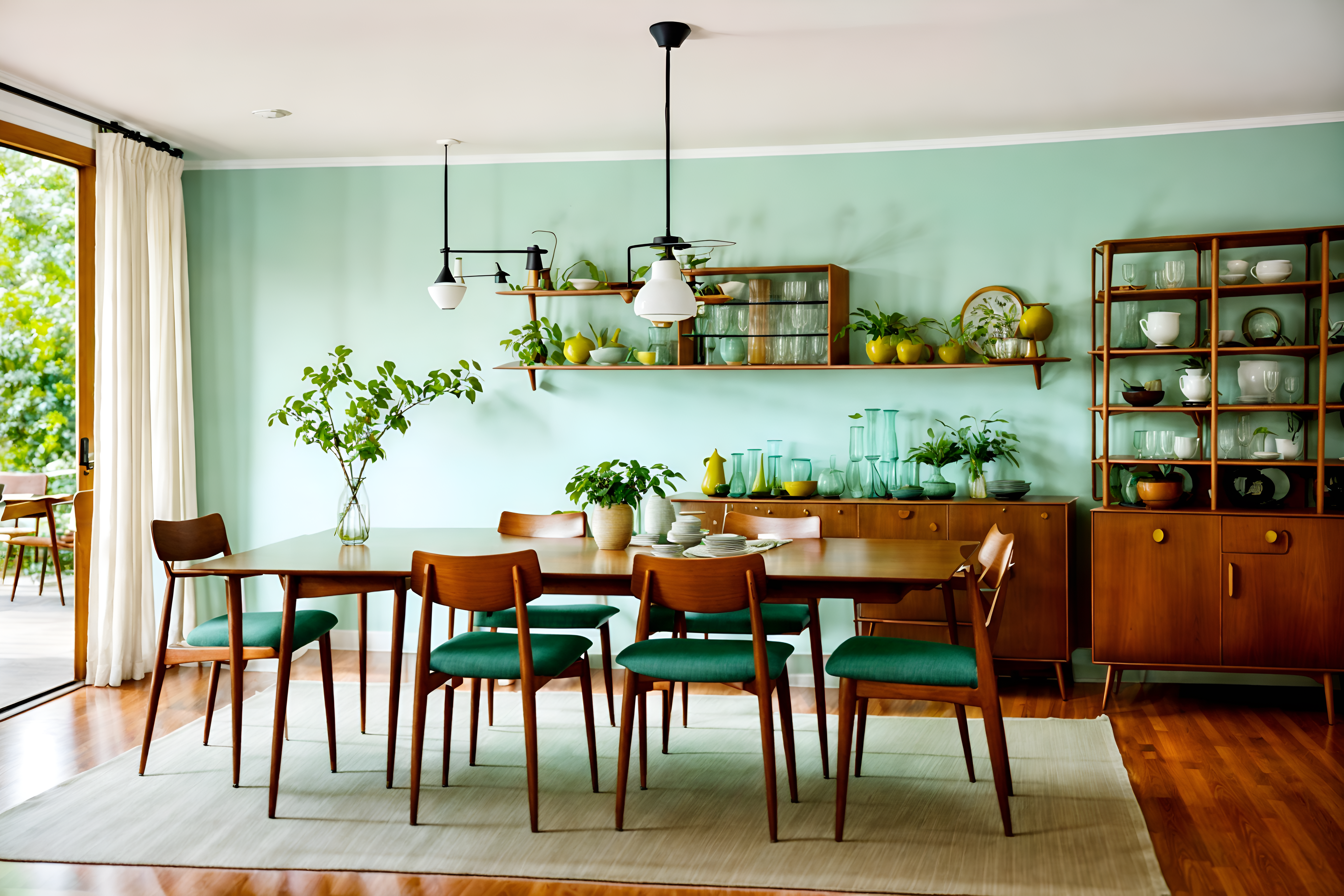 photo from pinterest of midcentury modern-style interior designed (dining room interior) with bookshelves and table cloth and vase and dining table chairs and dining table and plant and plates, cutlery and glasses on dining table and painting or photo on wall. . with integrating indoor and outdoor motifs and clean lines and muted tones and vibrant colors and minimalist and function over form and wood pendant light mid century modern chandelier and nature indoors. . cinematic photo, highly detailed, cinematic lighting, ultra-detailed, ultrarealistic, photorealism, 8k. trending on pinterest. midcentury modern interior design style. masterpiece, cinematic light, ultrarealistic+, photorealistic+, 8k, raw photo, realistic, sharp focus on eyes, (symmetrical eyes), (intact eyes), hyperrealistic, highest quality, best quality, , highly detailed, masterpiece, best quality, extremely detailed 8k wallpaper, masterpiece, best quality, ultra-detailed, best shadow, detailed background, detailed face, detailed eyes, high contrast, best illumination, detailed face, dulux, caustic, dynamic angle, detailed glow. dramatic lighting. highly detailed, insanely detailed hair, symmetrical, intricate details, professionally retouched, 8k high definition. strong bokeh. award winning photo.