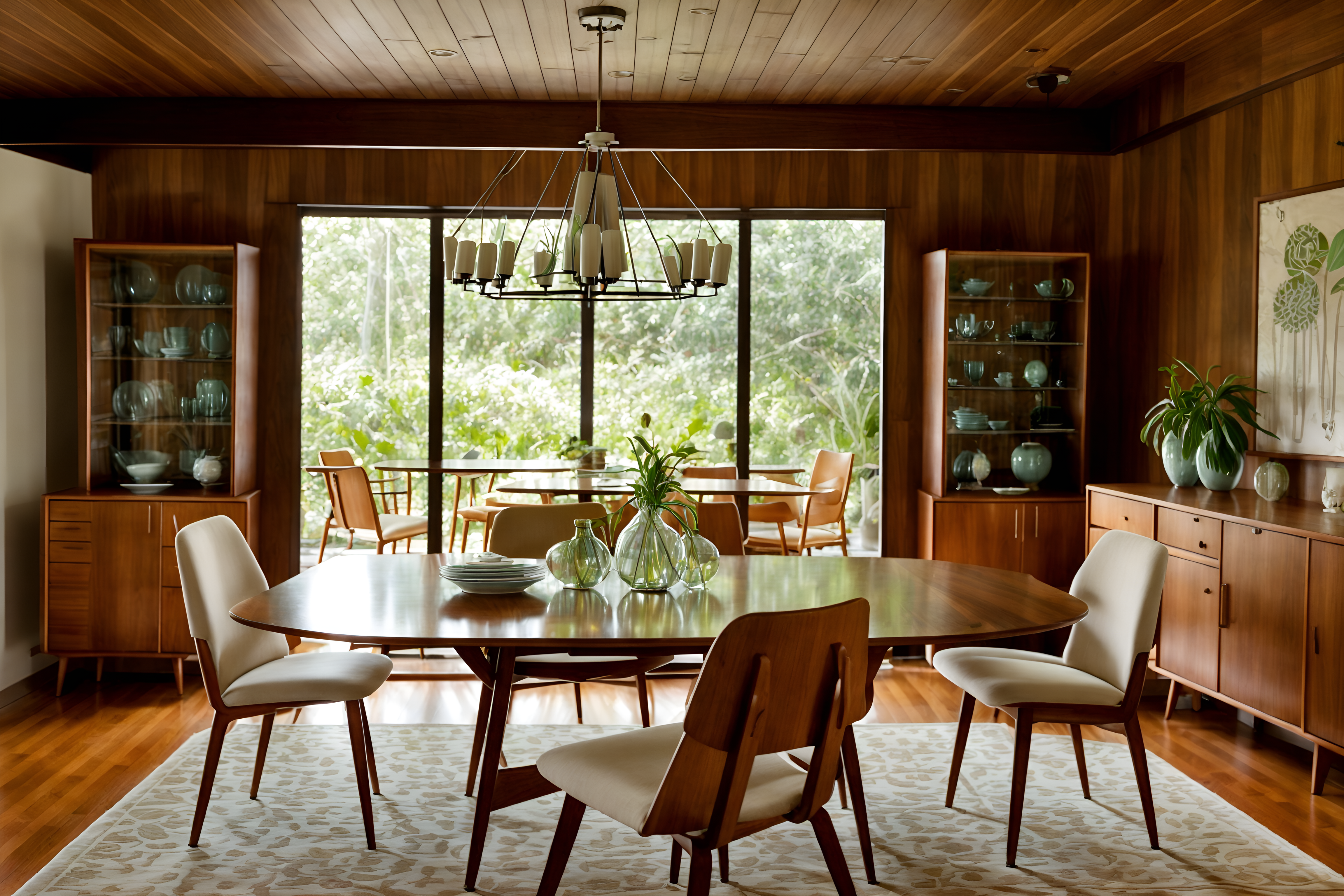 midcentury modern dining roomsinterior decorate this dining room with midcentury modern style. . . with vase and painting or photo on wall and dining table chairs and table cloth and plates, cutlery and glasses on dining table and light or chandelier and dining table and bookshelves. . with minimalist and muted tones and natural and manmade materials and function over form and organic and geometric shapes and graphic shapes and wood pendant light mid century modern chandelier and nature indoors. . .