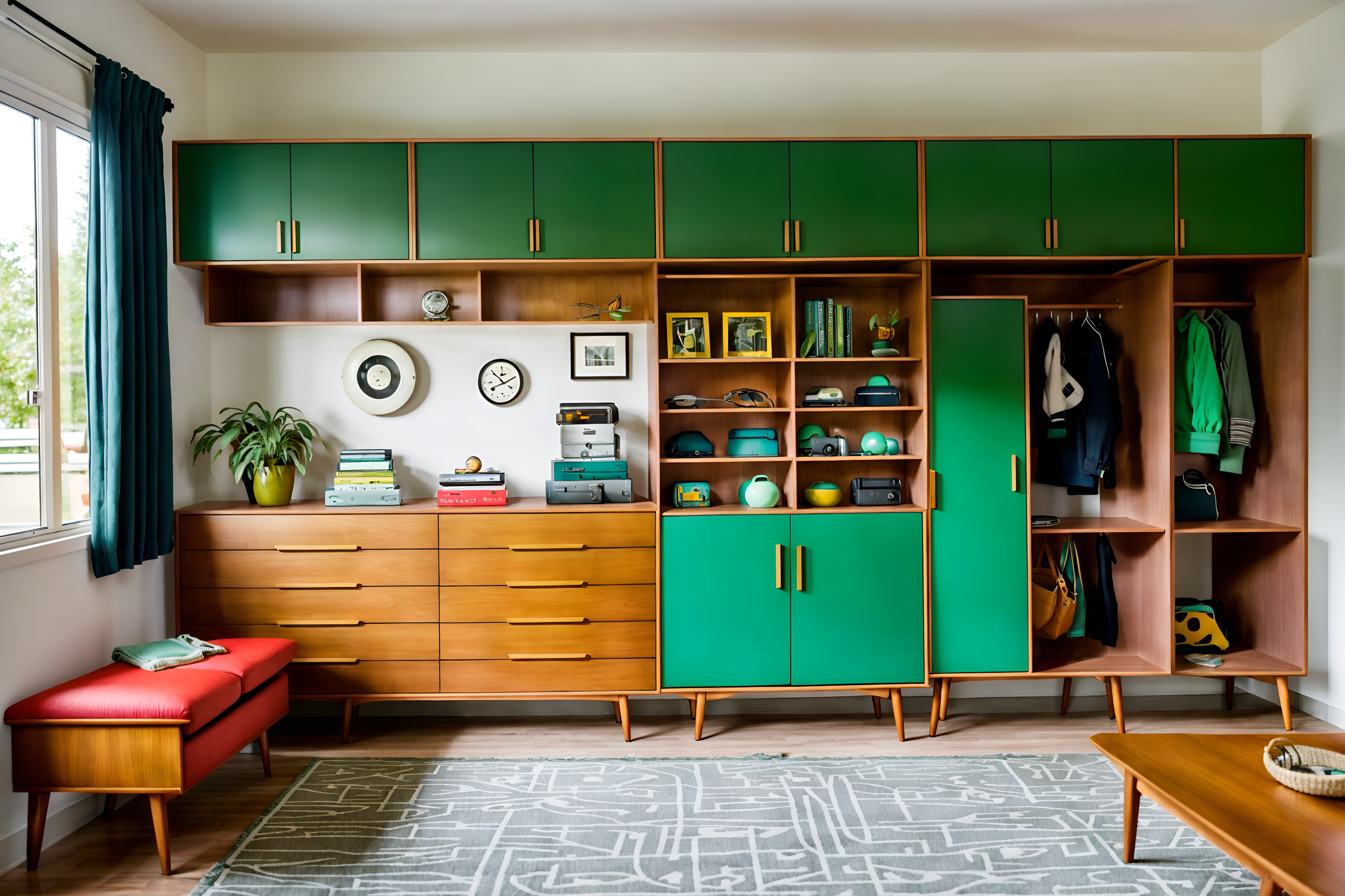 photo from pinterest of midcentury modern-style interior designed (drop zone interior) with shelves for shoes and a bench and storage drawers and storage baskets and wall hooks for coats and cabinets and lockers and high up storage. . with clean lines and integrating indoor and outdoor motifs and organic and geometric shapes and function over form and vibrant colors and nature indoors and natural and manmade materials and graphic shapes. . cinematic photo, highly detailed, cinematic lighting, ultra-detailed, ultrarealistic, photorealism, 8k. trending on pinterest. midcentury modern interior design style. masterpiece, cinematic light, ultrarealistic+, photorealistic+, 8k, raw photo, realistic, sharp focus on eyes, (symmetrical eyes), (intact eyes), hyperrealistic, highest quality, best quality, , highly detailed, masterpiece, best quality, extremely detailed 8k wallpaper, masterpiece, best quality, ultra-detailed, best shadow, detailed background, detailed face, detailed eyes, high contrast, best illumination, detailed face, dulux, caustic, dynamic angle, detailed glow. dramatic lighting. highly detailed, insanely detailed hair, symmetrical, intricate details, professionally retouched, 8k high definition. strong bokeh. award winning photo.
