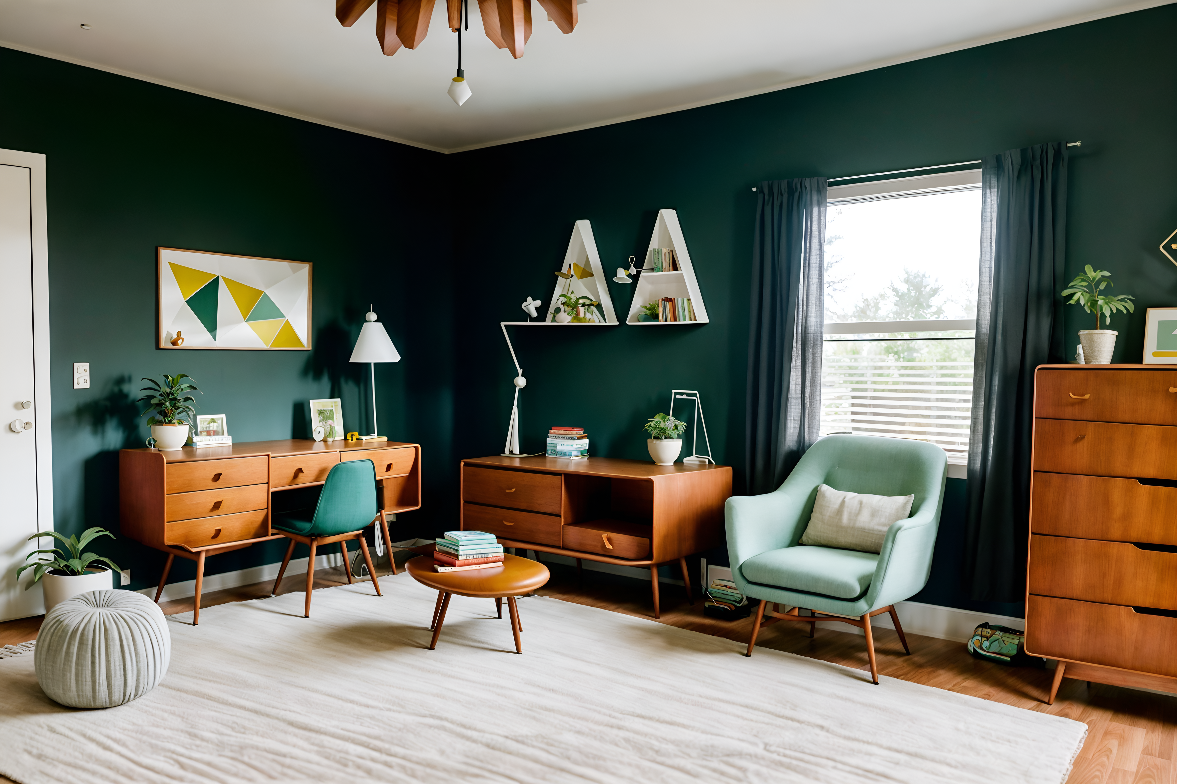 photo from pinterest of midcentury modern-style interior designed (kids room interior) with storage bench or ottoman and headboard and bed and plant and kids desk and dresser closet and bedside table or night stand and accent chair. . with organic and geometric shapes and mid century modern mobile chandelier and minimalist and nature indoors and muted tones and function over form and graphic shapes and clean lines. . cinematic photo, highly detailed, cinematic lighting, ultra-detailed, ultrarealistic, photorealism, 8k. trending on pinterest. midcentury modern interior design style. masterpiece, cinematic light, ultrarealistic+, photorealistic+, 8k, raw photo, realistic, sharp focus on eyes, (symmetrical eyes), (intact eyes), hyperrealistic, highest quality, best quality, , highly detailed, masterpiece, best quality, extremely detailed 8k wallpaper, masterpiece, best quality, ultra-detailed, best shadow, detailed background, detailed face, detailed eyes, high contrast, best illumination, detailed face, dulux, caustic, dynamic angle, detailed glow. dramatic lighting. highly detailed, insanely detailed hair, symmetrical, intricate details, professionally retouched, 8k high definition. strong bokeh. award winning photo.