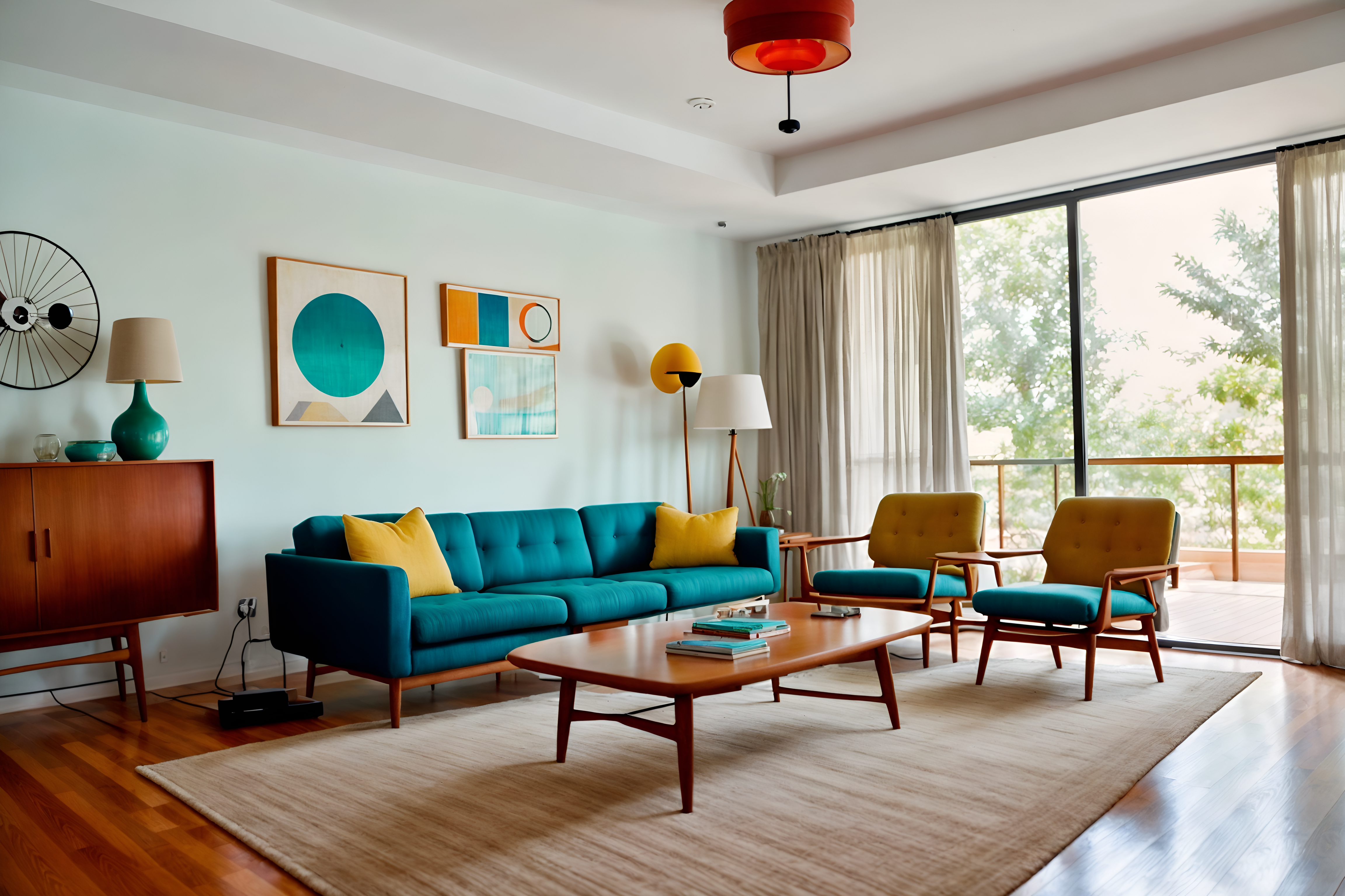 Photo from Pinterest of Midcentury modern-style interior designed (living room interior) With televisions and electric lamps and furniture and rug and coffee tables and occasional tables and sofa and chairs. . With integrating indoor and outdoor motifs and vibrant colors and graphic shapes and organic and geometric shapes and function over form and natural and manmade materials and muted tones and clean lines. . Cinematic photo, highly detailed, cinematic lighting, ultra-detailed, ultrarealistic, photorealism, 8k. Trending on Pinterest. Midcentury modern interior design style