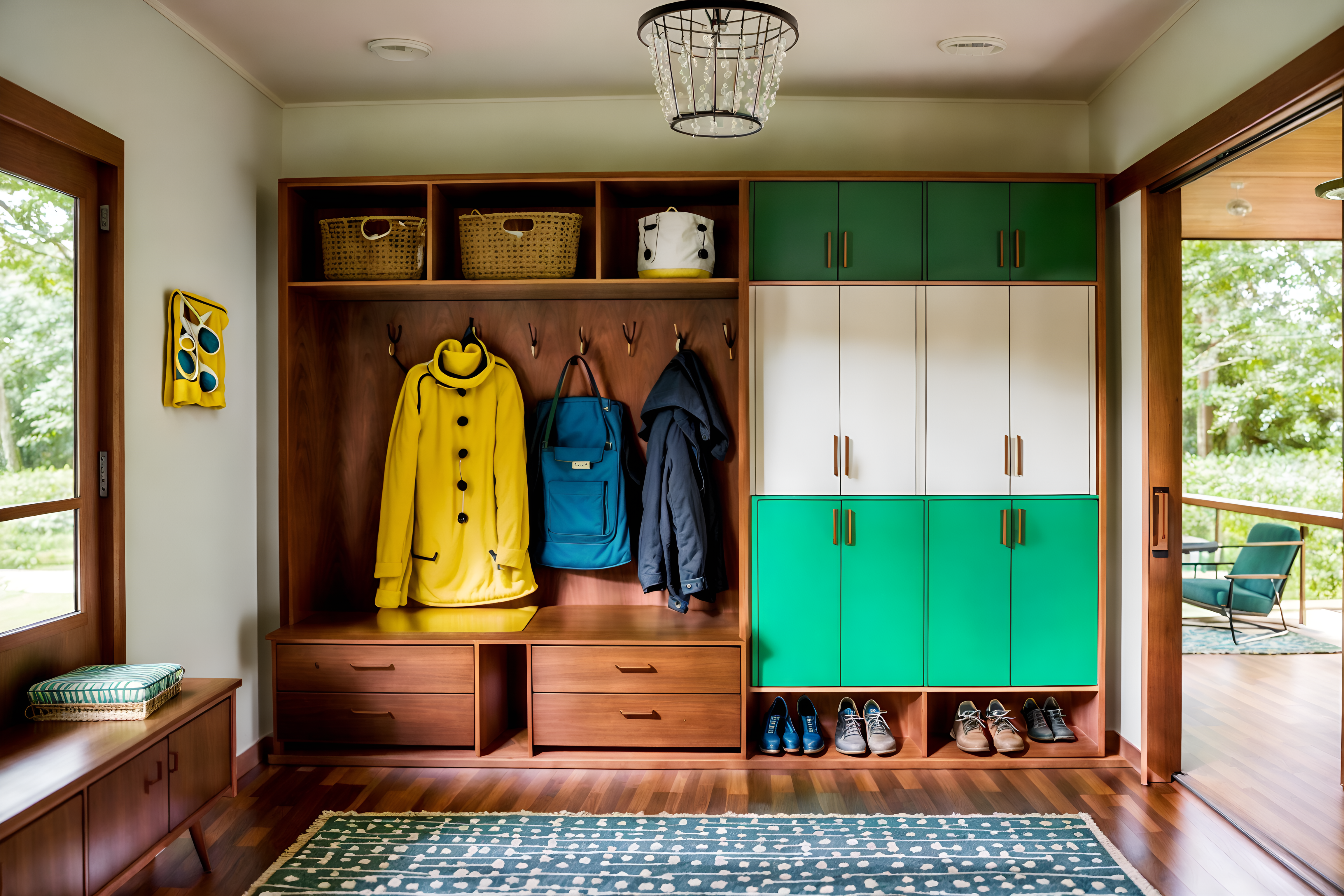 photo from pinterest of midcentury modern-style interior designed (mudroom interior) with high up storage and a bench and cubbies and cabinets and wall hooks for coats and shelves for shoes and storage baskets and storage drawers. . with function over form and minimalist and mid century modern mobile chandelier and vibrant colors and integrating indoor and outdoor motifs and nature indoors and wood pendant light mid century modern chandelier and graphic shapes. . cinematic photo, highly detailed, cinematic lighting, ultra-detailed, ultrarealistic, photorealism, 8k. trending on pinterest. midcentury modern interior design style. masterpiece, cinematic light, ultrarealistic+, photorealistic+, 8k, raw photo, realistic, sharp focus on eyes, (symmetrical eyes), (intact eyes), hyperrealistic, highest quality, best quality, , highly detailed, masterpiece, best quality, extremely detailed 8k wallpaper, masterpiece, best quality, ultra-detailed, best shadow, detailed background, detailed face, detailed eyes, high contrast, best illumination, detailed face, dulux, caustic, dynamic angle, detailed glow. dramatic lighting. highly detailed, insanely detailed hair, symmetrical, intricate details, professionally retouched, 8k high definition. strong bokeh. award winning photo.