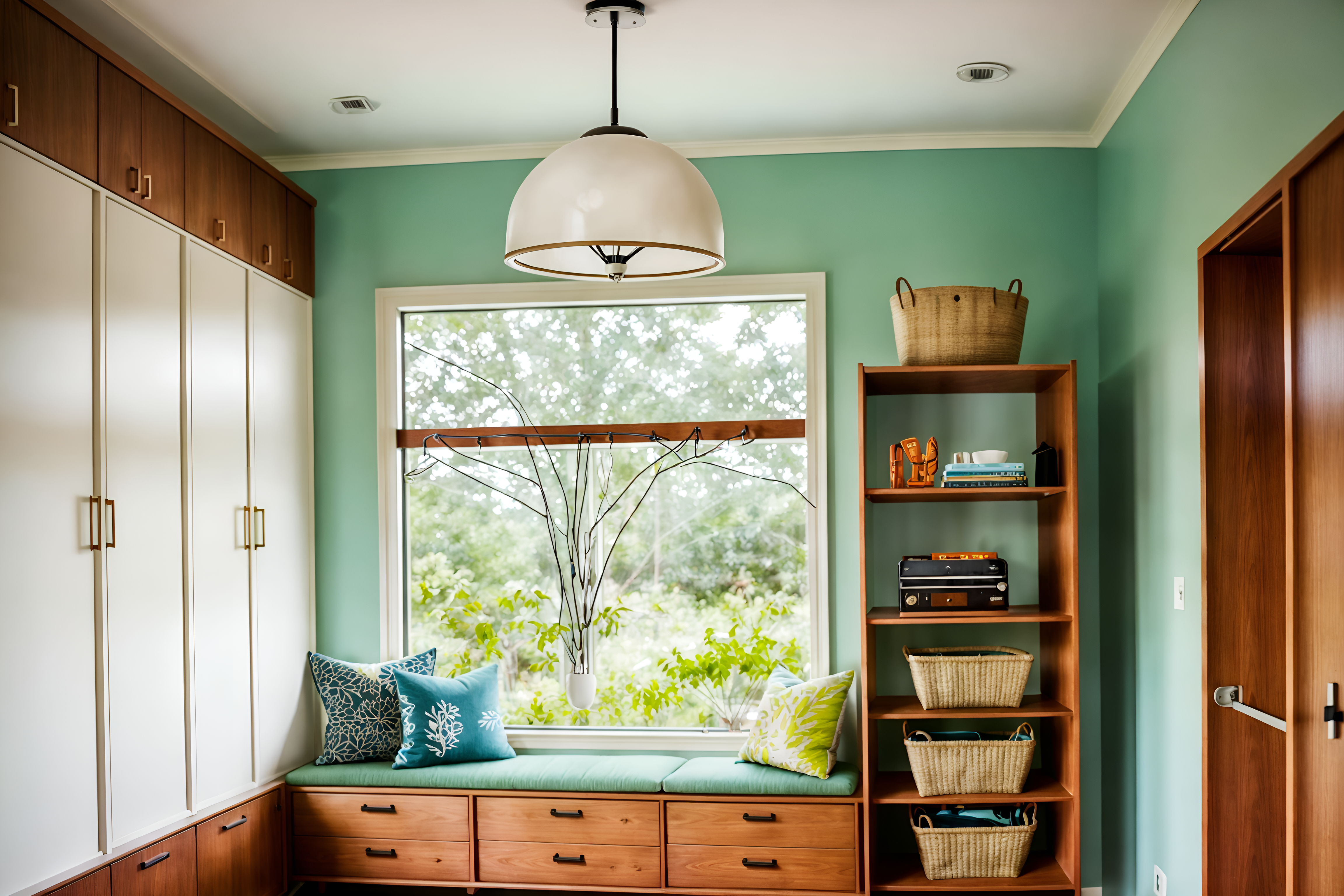 photo from pinterest of midcentury modern-style interior designed (mudroom interior) with high up storage and a bench and cubbies and cabinets and wall hooks for coats and shelves for shoes and storage baskets and storage drawers. . with function over form and minimalist and mid century modern mobile chandelier and vibrant colors and integrating indoor and outdoor motifs and nature indoors and wood pendant light mid century modern chandelier and graphic shapes. . cinematic photo, highly detailed, cinematic lighting, ultra-detailed, ultrarealistic, photorealism, 8k. trending on pinterest. midcentury modern interior design style. masterpiece, cinematic light, ultrarealistic+, photorealistic+, 8k, raw photo, realistic, sharp focus on eyes, (symmetrical eyes), (intact eyes), hyperrealistic, highest quality, best quality, , highly detailed, masterpiece, best quality, extremely detailed 8k wallpaper, masterpiece, best quality, ultra-detailed, best shadow, detailed background, detailed face, detailed eyes, high contrast, best illumination, detailed face, dulux, caustic, dynamic angle, detailed glow. dramatic lighting. highly detailed, insanely detailed hair, symmetrical, intricate details, professionally retouched, 8k high definition. strong bokeh. award winning photo.