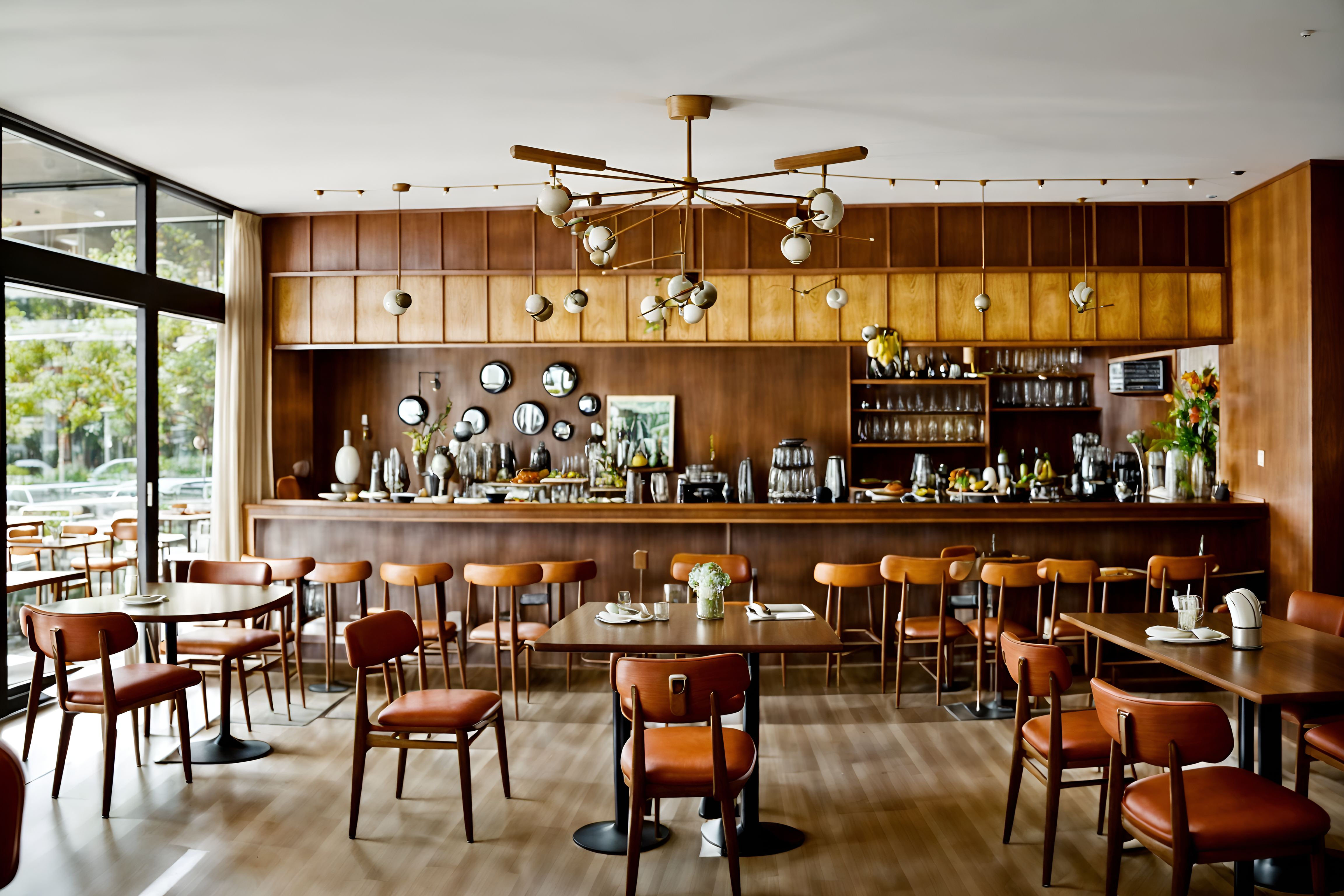 photo from pinterest of midcentury modern-style interior designed (restaurant interior) with restaurant decor and restaurant dining tables and restaurant bar and restaurant chairs and restaurant decor. . with function over form and organic and geometric shapes and mid century modern mobile chandelier and clean lines and graphic shapes and natural and manmade materials and muted tones and integrating indoor and outdoor motifs. . cinematic photo, highly detailed, cinematic lighting, ultra-detailed, ultrarealistic, photorealism, 8k. trending on pinterest. midcentury modern interior design style. masterpiece, cinematic light, ultrarealistic+, photorealistic+, 8k, raw photo, realistic, sharp focus on eyes, (symmetrical eyes), (intact eyes), hyperrealistic, highest quality, best quality, , highly detailed, masterpiece, best quality, extremely detailed 8k wallpaper, masterpiece, best quality, ultra-detailed, best shadow, detailed background, detailed face, detailed eyes, high contrast, best illumination, detailed face, dulux, caustic, dynamic angle, detailed glow. dramatic lighting. highly detailed, insanely detailed hair, symmetrical, intricate details, professionally retouched, 8k high definition. strong bokeh. award winning photo.