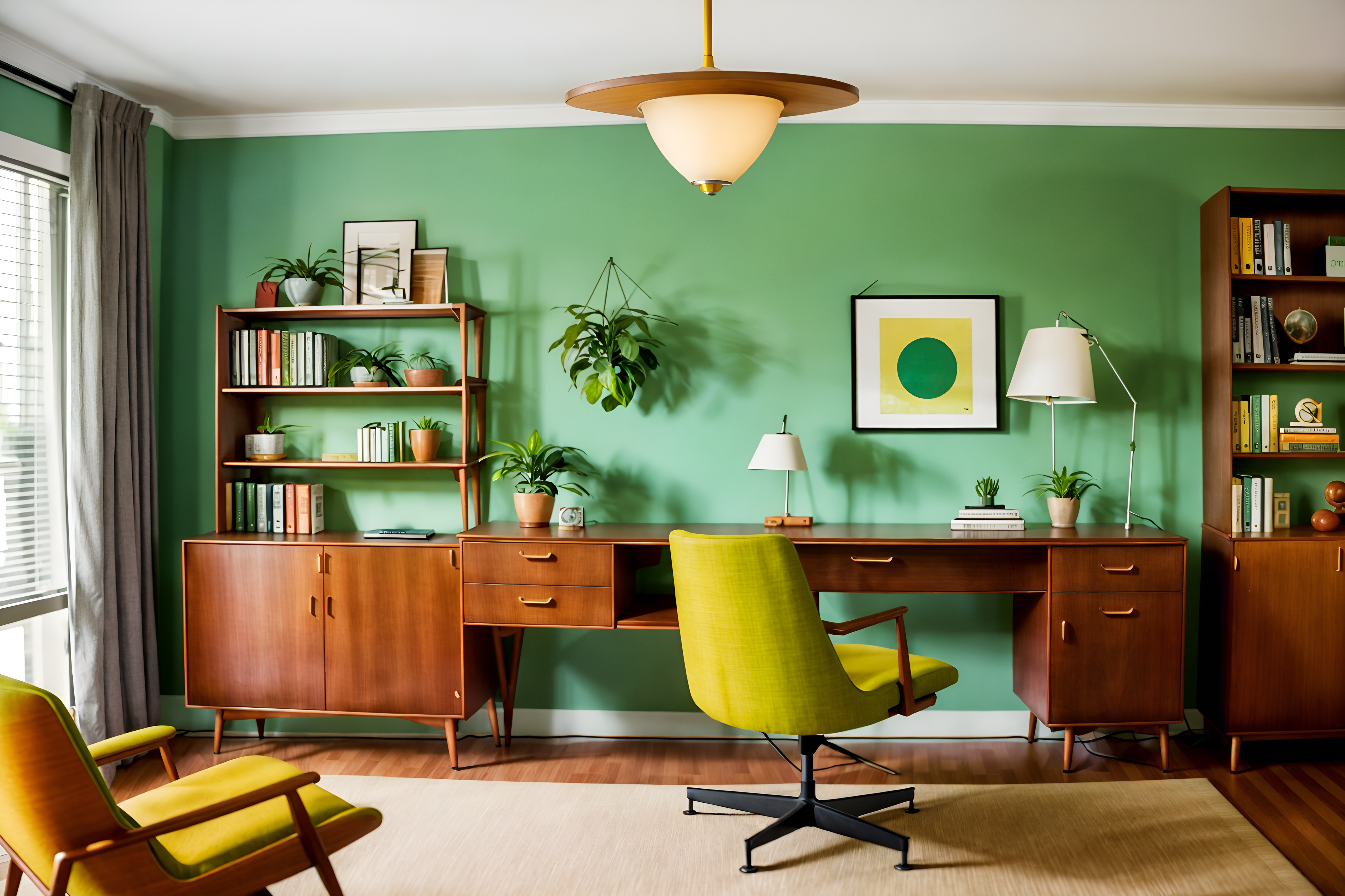 midcentury modern study roomsinterior decorate this study room with midcentury modern style. . . with cabinets and desk lamp and plant and lounge chair and bookshelves and office chair and writing desk and cabinets. . with muted tones and integrating indoor and outdoor motifs and vibrant colors and mid century modern mobile chandelier and organic and geometric shapes and minimalist and function over form and wood pendant light mid century modern chandelier. . .