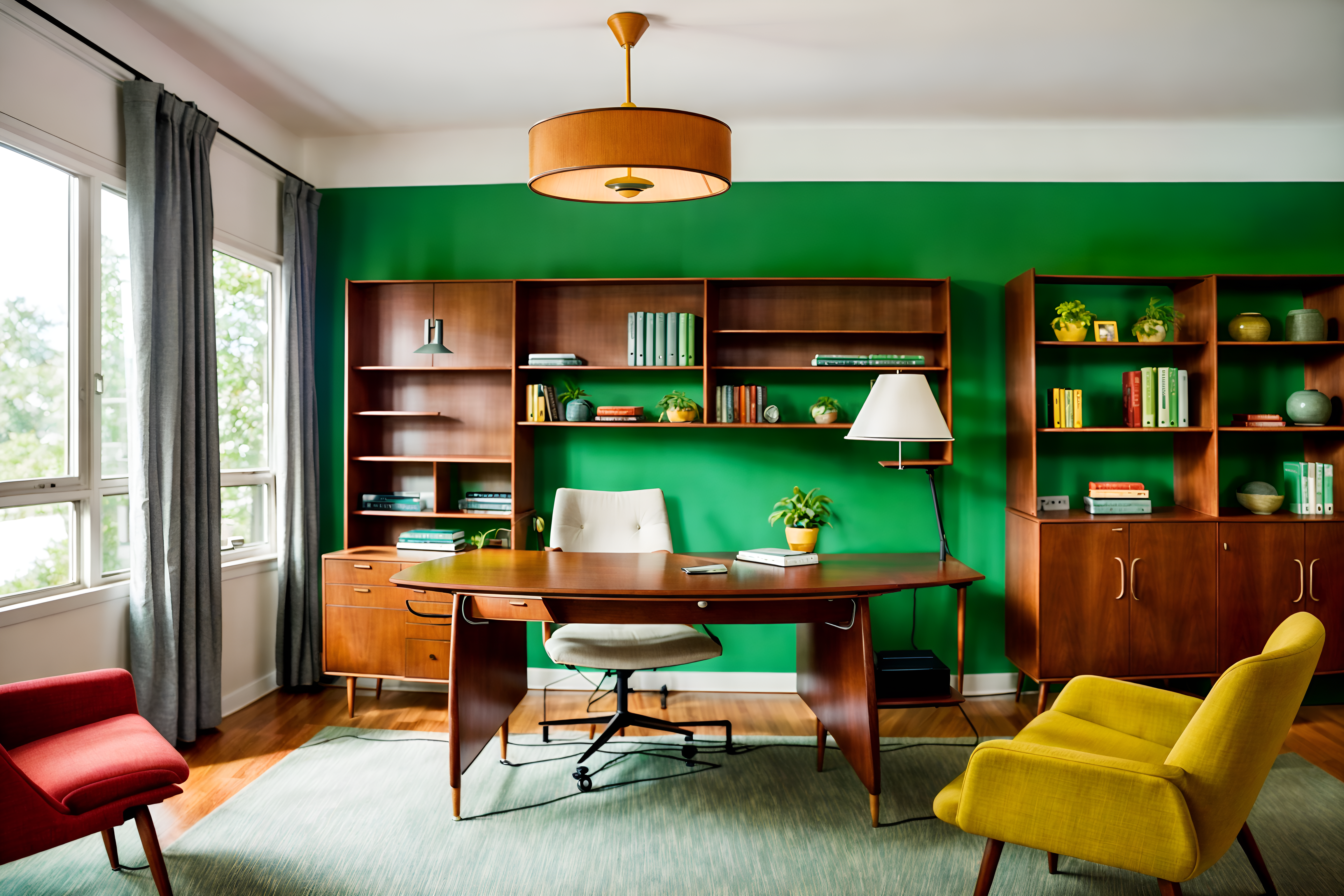 midcentury modern study roomsinterior decorate this study room with midcentury modern style. . . with cabinets and desk lamp and plant and lounge chair and bookshelves and office chair and writing desk and cabinets. . with muted tones and integrating indoor and outdoor motifs and vibrant colors and mid century modern mobile chandelier and organic and geometric shapes and minimalist and function over form and wood pendant light mid century modern chandelier. . .