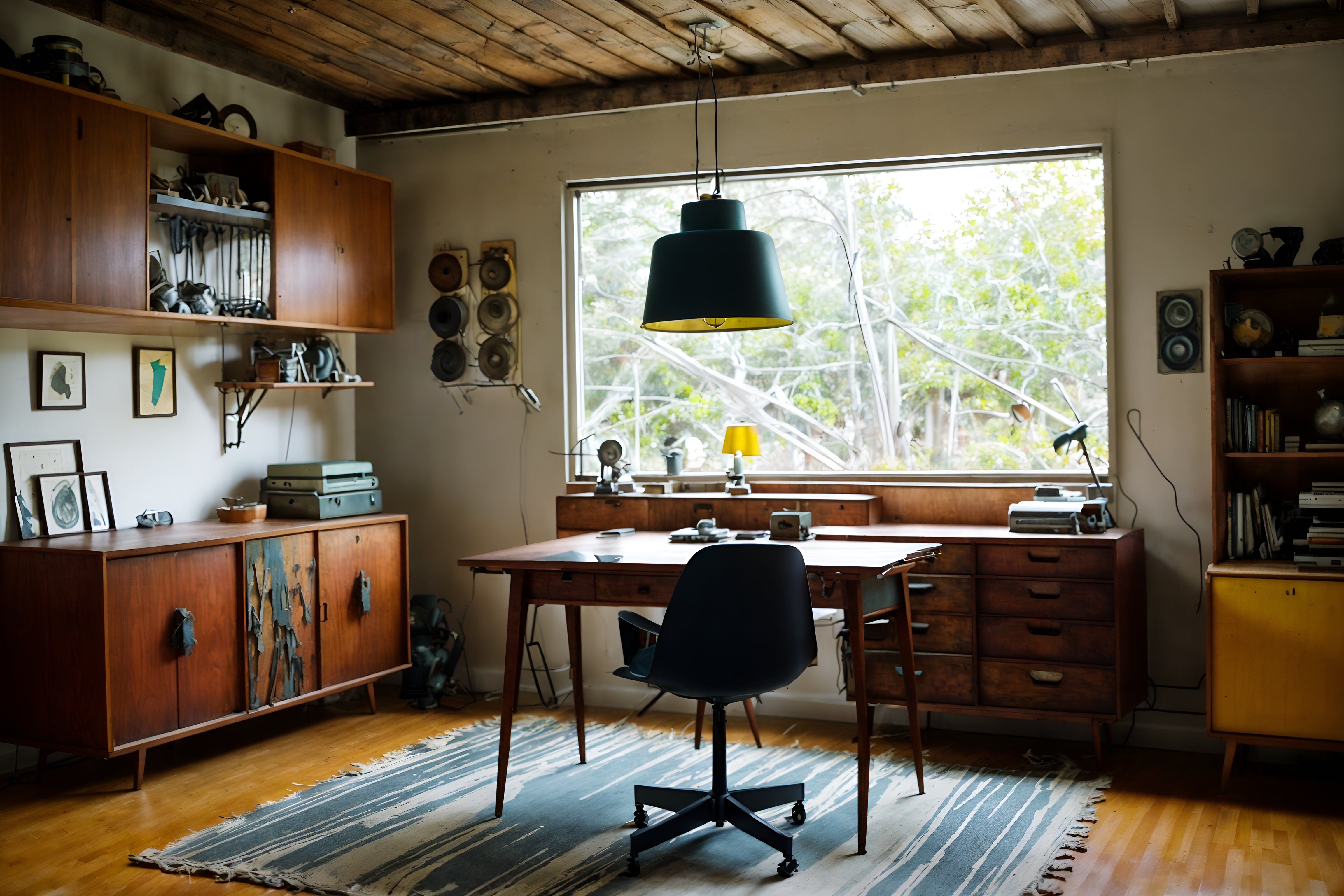 midcentury modern workshopsinterior decorate this workshop with midcentury modern style. . . with wooden workbench and messy and tool wall and wooden workbench. . with minimalist and vibrant colors and integrating indoor and outdoor motifs and clean lines and graphic shapes and muted tones and mid century modern mobile chandelier and natural and manmade materials. . .