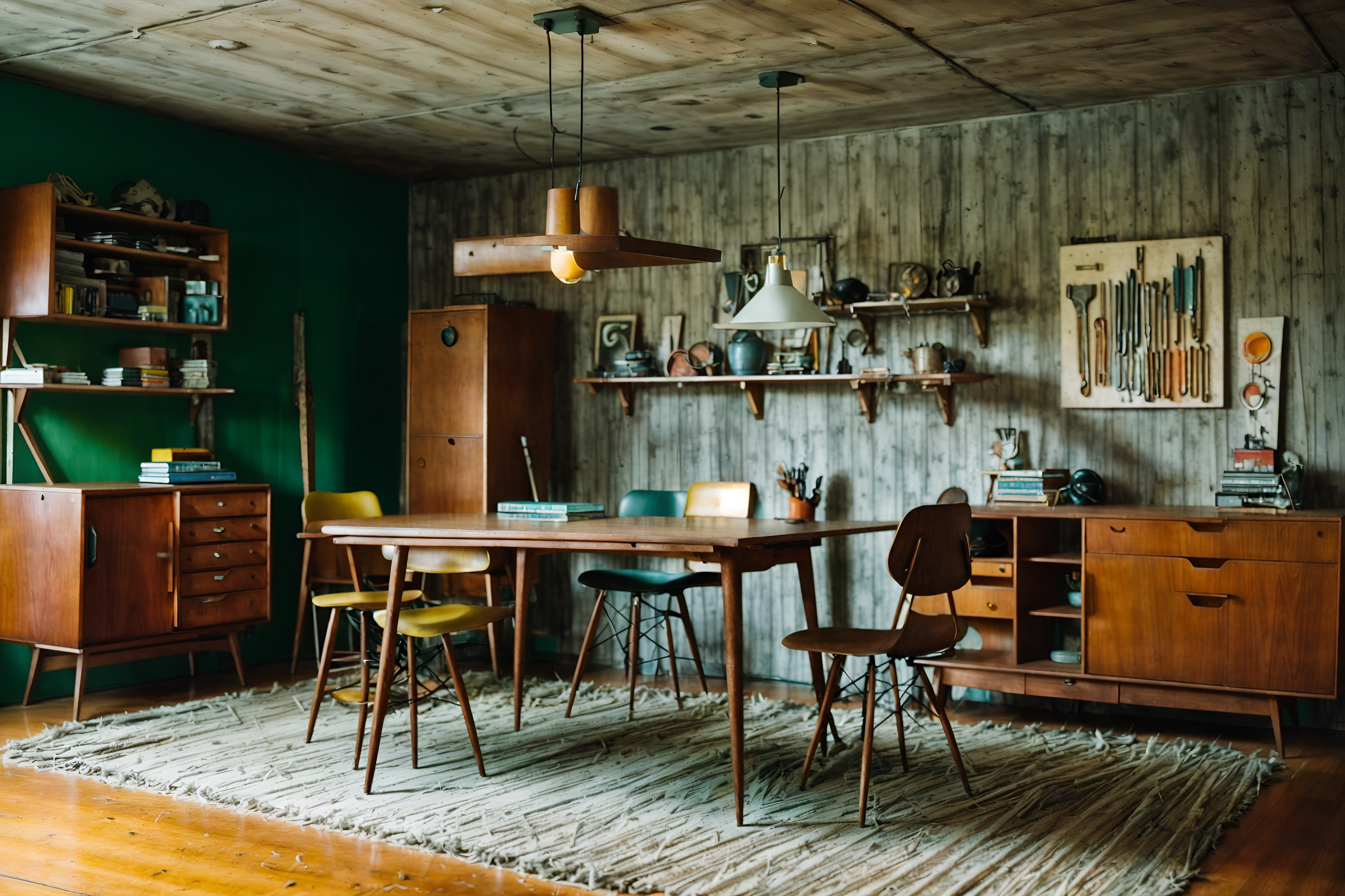 photo from pinterest of midcentury modern-style interior designed (workshop interior) with messy and wooden workbench and tool wall and messy. . with graphic shapes and muted tones and organic and geometric shapes and vibrant colors and natural and manmade materials and mid century modern mobile chandelier and minimalist and function over form. . cinematic photo, highly detailed, cinematic lighting, ultra-detailed, ultrarealistic, photorealism, 8k. trending on pinterest. midcentury modern interior design style. masterpiece, cinematic light, ultrarealistic+, photorealistic+, 8k, raw photo, realistic, sharp focus on eyes, (symmetrical eyes), (intact eyes), hyperrealistic, highest quality, best quality, , highly detailed, masterpiece, best quality, extremely detailed 8k wallpaper, masterpiece, best quality, ultra-detailed, best shadow, detailed background, detailed face, detailed eyes, high contrast, best illumination, detailed face, dulux, caustic, dynamic angle, detailed glow. dramatic lighting. highly detailed, insanely detailed hair, symmetrical, intricate details, professionally retouched, 8k high definition. strong bokeh. award winning photo.