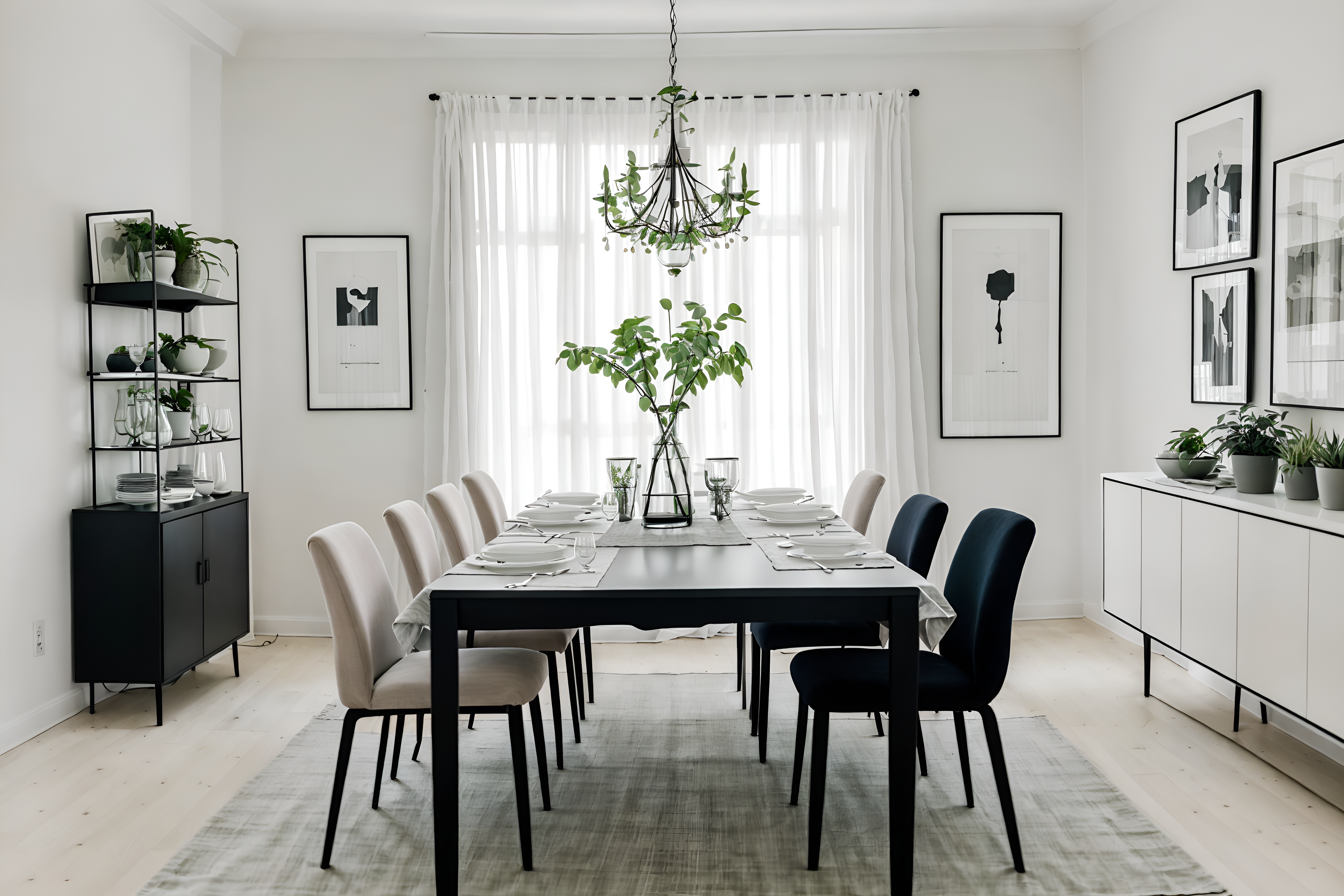 photo from pinterest of minimalist-style interior designed (dining room interior) with painting or photo on wall and table cloth and plates, cutlery and glasses on dining table and plant and bookshelves and dining table and light or chandelier and vase. . with an open floor plan and a monochromatic palette with colour used as an accent and lots of light and focus on the shape, colour and texture of just a few of essential elements and functional furniture and clean lines and an open floor plan. . cinematic photo, highly detailed, cinematic lighting, ultra-detailed, ultrarealistic, photorealism, 8k. trending on pinterest. minimalist interior design style. masterpiece, cinematic light, ultrarealistic+, photorealistic+, 8k, raw photo, realistic, sharp focus on eyes, (symmetrical eyes), (intact eyes), hyperrealistic, highest quality, best quality, , highly detailed, masterpiece, best quality, extremely detailed 8k wallpaper, masterpiece, best quality, ultra-detailed, best shadow, detailed background, detailed face, detailed eyes, high contrast, best illumination, detailed face, dulux, caustic, dynamic angle, detailed glow. dramatic lighting. highly detailed, insanely detailed hair, symmetrical, intricate details, professionally retouched, 8k high definition. strong bokeh. award winning photo.