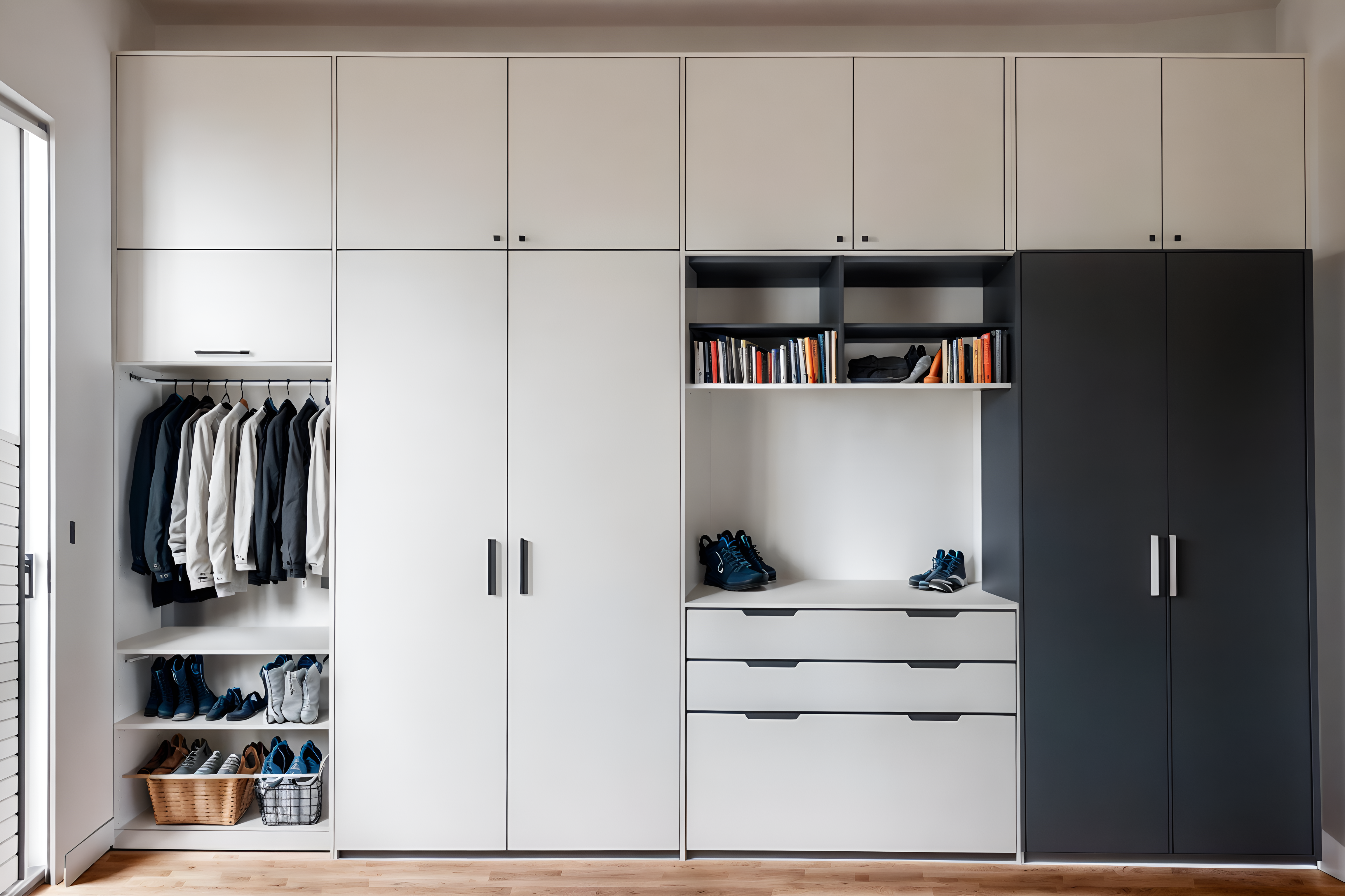 photo from pinterest of minimalist-style interior designed (drop zone interior) with cabinets and storage drawers and storage baskets and high up storage and lockers and cubbies and wall hooks for coats and shelves for shoes. . with functional furniture and a monochromatic palette with colour used as an accent and lots of light and clean lines and focus on the shape, colour and texture of just a few of essential elements and an open floor plan and functional furniture. . cinematic photo, highly detailed, cinematic lighting, ultra-detailed, ultrarealistic, photorealism, 8k. trending on pinterest. minimalist interior design style. masterpiece, cinematic light, ultrarealistic+, photorealistic+, 8k, raw photo, realistic, sharp focus on eyes, (symmetrical eyes), (intact eyes), hyperrealistic, highest quality, best quality, , highly detailed, masterpiece, best quality, extremely detailed 8k wallpaper, masterpiece, best quality, ultra-detailed, best shadow, detailed background, detailed face, detailed eyes, high contrast, best illumination, detailed face, dulux, caustic, dynamic angle, detailed glow. dramatic lighting. highly detailed, insanely detailed hair, symmetrical, intricate details, professionally retouched, 8k high definition. strong bokeh. award winning photo.