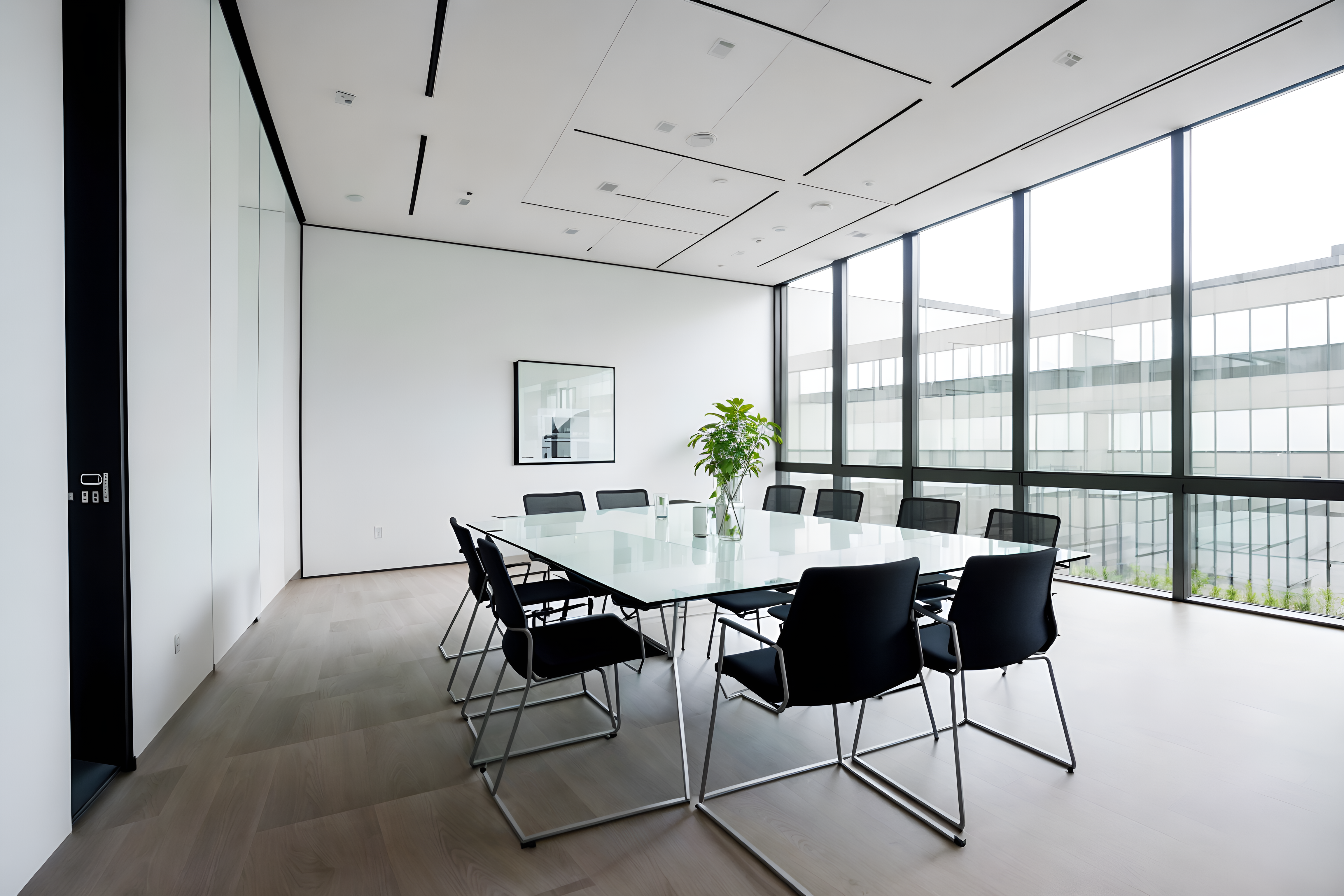 minimalist meeting roomsinterior decorate this meeting room with minimalist style. . . with glass walls and plant and boardroom table and vase and glass doors and painting or photo on wall and cabinets and office chairs. . with functional furniture and clean lines and a monochromatic palette with colour used as an accent and focus on the shape, colour and texture of just a few of essential elements and an open floor plan and lots of light and functional furniture. . .