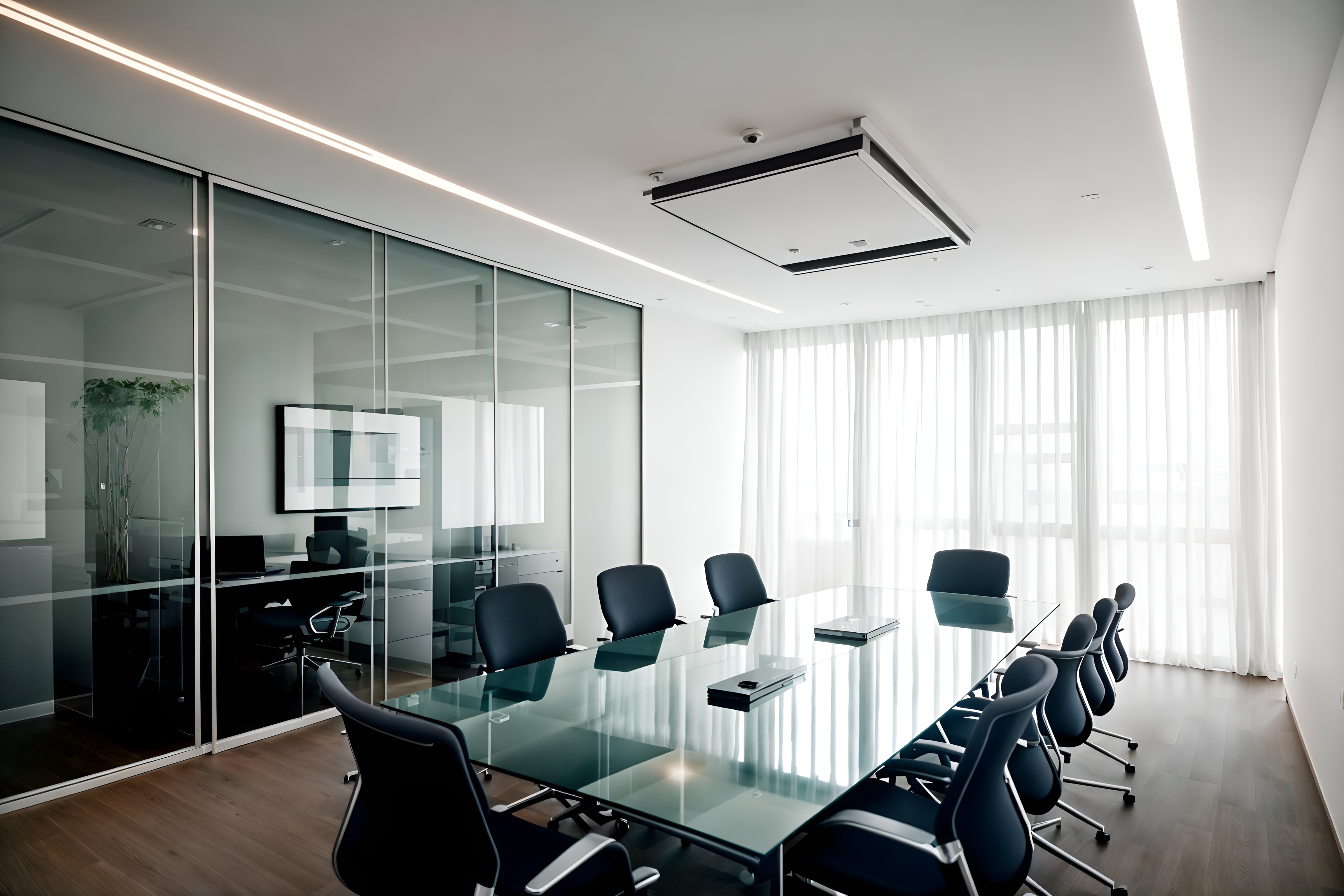 minimalist meeting roomsinterior decorate this meeting room with minimalist style. . . with glass walls and plant and boardroom table and vase and glass doors and painting or photo on wall and cabinets and office chairs. . with functional furniture and clean lines and a monochromatic palette with colour used as an accent and focus on the shape, colour and texture of just a few of essential elements and an open floor plan and lots of light and functional furniture. . .