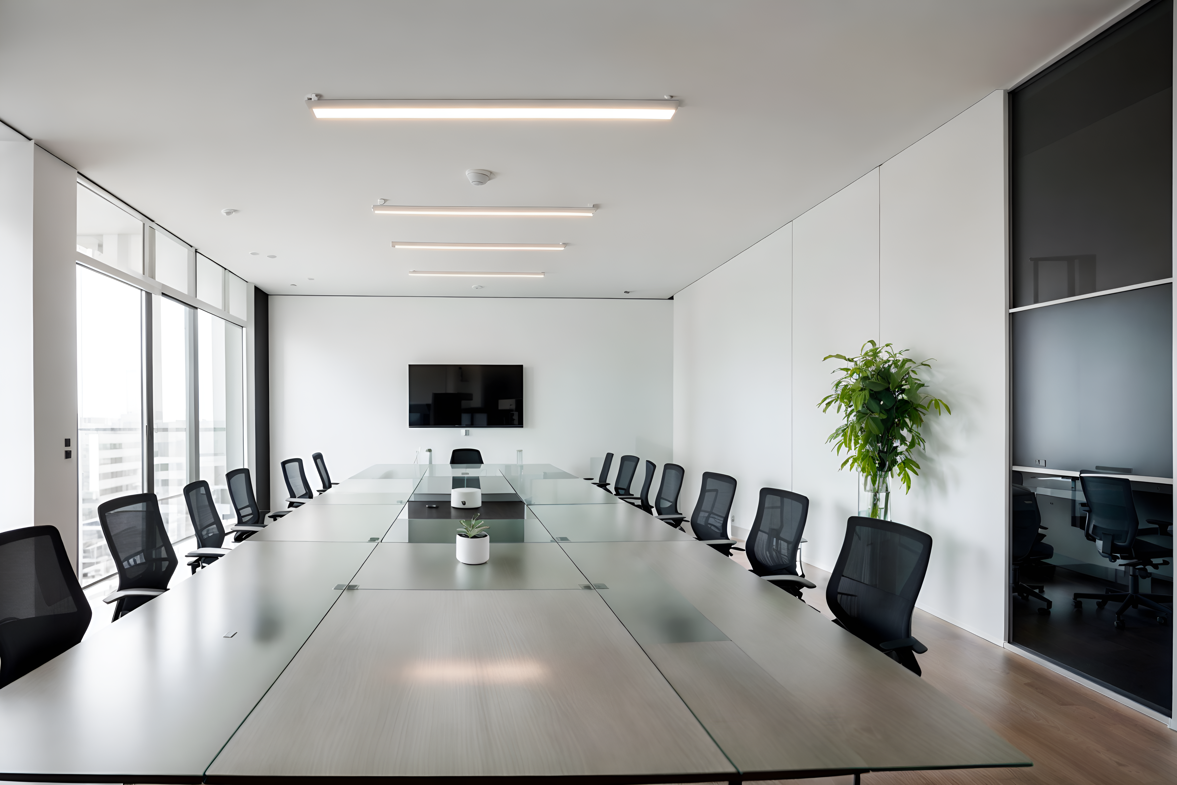 minimalist meeting roomsinterior decorate this meeting room with minimalist style. . . with glass walls and plant and boardroom table and vase and glass doors and painting or photo on wall and cabinets and office chairs. . with functional furniture and clean lines and a monochromatic palette with colour used as an accent and focus on the shape, colour and texture of just a few of essential elements and an open floor plan and lots of light and functional furniture. . .