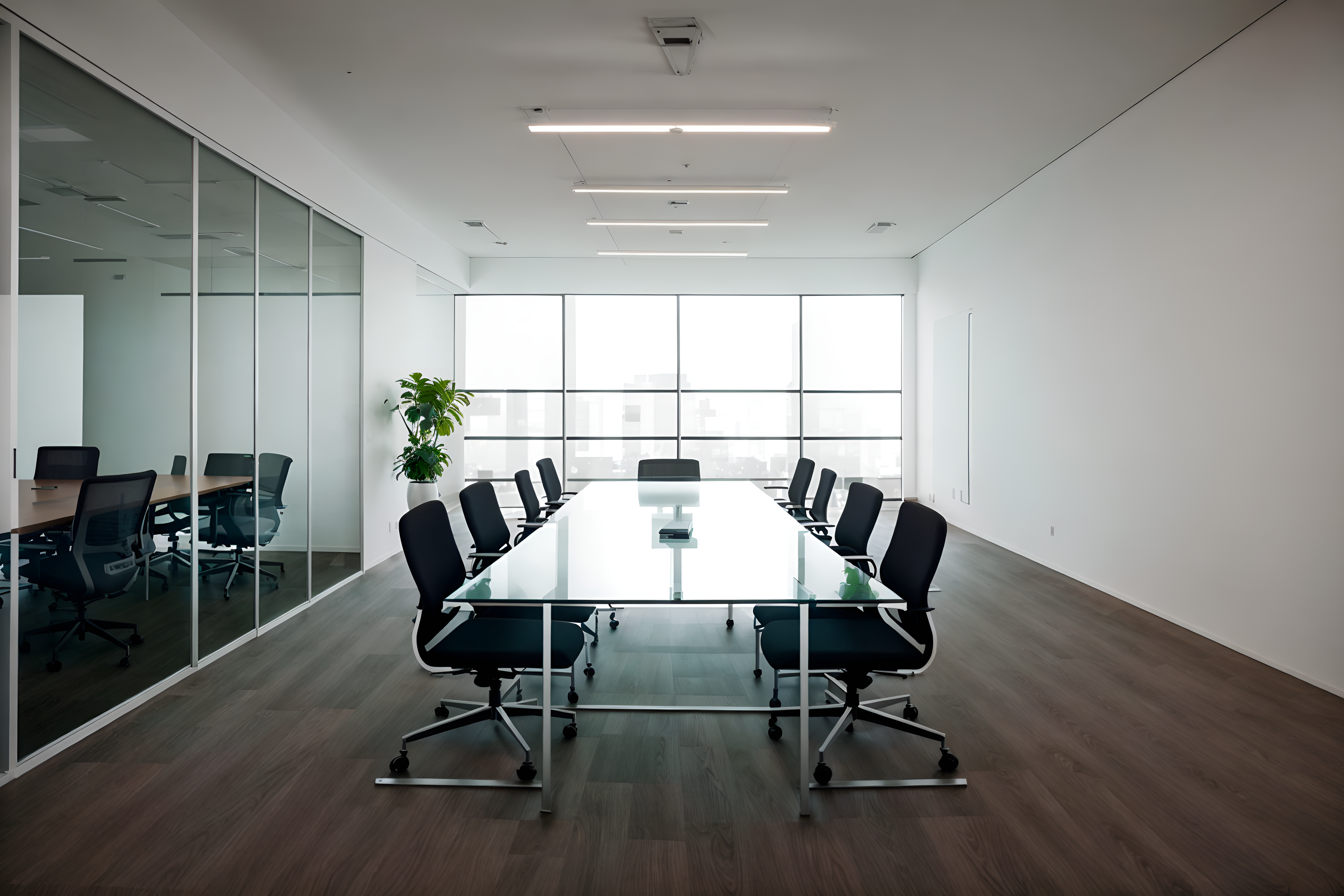 minimalist meeting roomsinterior decorate this meeting room with minimalist style. . . with glass walls and plant and boardroom table and vase and glass doors and painting or photo on wall and cabinets and office chairs. . with functional furniture and clean lines and a monochromatic palette with colour used as an accent and focus on the shape, colour and texture of just a few of essential elements and an open floor plan and lots of light and functional furniture. . .