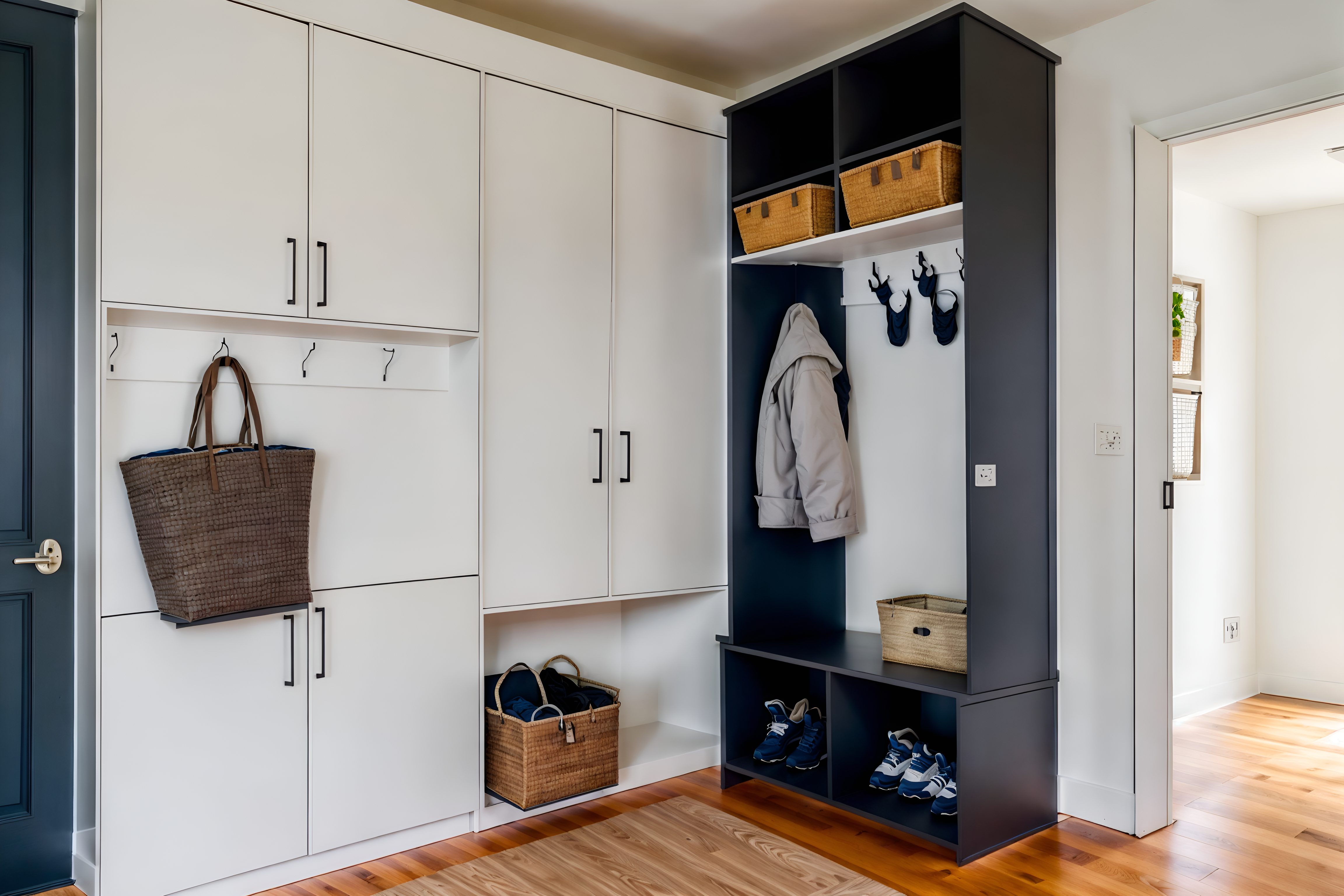 photo from pinterest of minimalist-style interior designed (mudroom interior) with storage drawers and high up storage and cubbies and storage baskets and cabinets and wall hooks for coats and shelves for shoes and a bench. . with focus on the shape, colour and texture of just a few of essential elements and functional furniture and an open floor plan and clean lines and a monochromatic palette with colour used as an accent and lots of light and focus on the shape, colour and texture of just a few of essential elements. . cinematic photo, highly detailed, cinematic lighting, ultra-detailed, ultrarealistic, photorealism, 8k. trending on pinterest. minimalist interior design style. masterpiece, cinematic light, ultrarealistic+, photorealistic+, 8k, raw photo, realistic, sharp focus on eyes, (symmetrical eyes), (intact eyes), hyperrealistic, highest quality, best quality, , highly detailed, masterpiece, best quality, extremely detailed 8k wallpaper, masterpiece, best quality, ultra-detailed, best shadow, detailed background, detailed face, detailed eyes, high contrast, best illumination, detailed face, dulux, caustic, dynamic angle, detailed glow. dramatic lighting. highly detailed, insanely detailed hair, symmetrical, intricate details, professionally retouched, 8k high definition. strong bokeh. award winning photo.