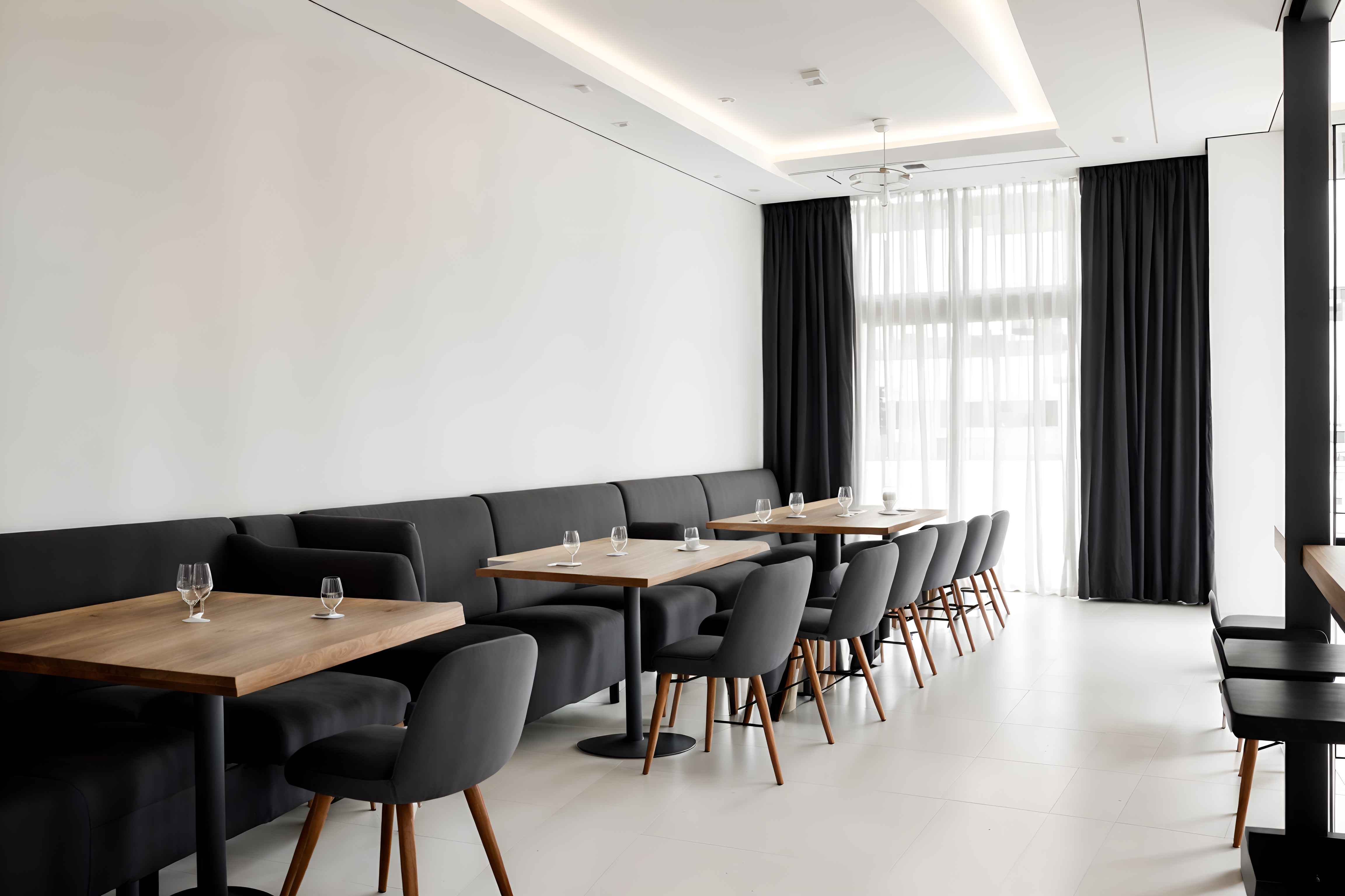 minimalist restaurantsinterior decorate this restaurant with minimalist style. . . with restaurant decor and restaurant chairs and restaurant bar and restaurant dining tables and restaurant decor. . with clean lines and focus on the shape, colour and texture of just a few of essential elements and lots of light and an open floor plan and functional furniture and a monochromatic palette with colour used as an accent and clean lines. . .