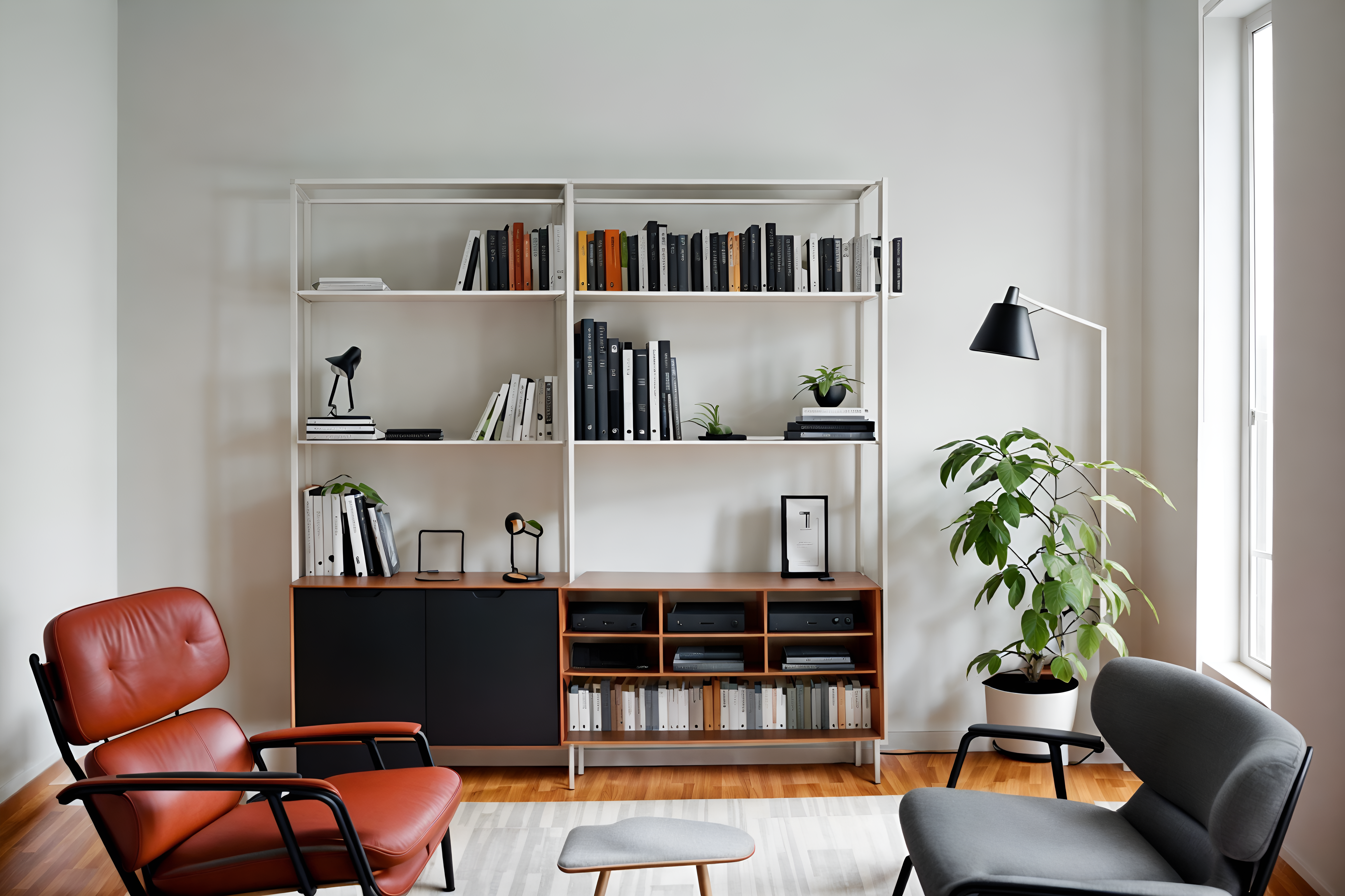minimalist study roomsinterior decorate this study room with minimalist style. . . with bookshelves and office chair and lounge chair and cabinets and desk lamp and writing desk and plant and bookshelves. . with clean lines and lots of light and an open floor plan and functional furniture and focus on the shape, colour and texture of just a few of essential elements and a monochromatic palette with colour used as an accent and clean lines. . .