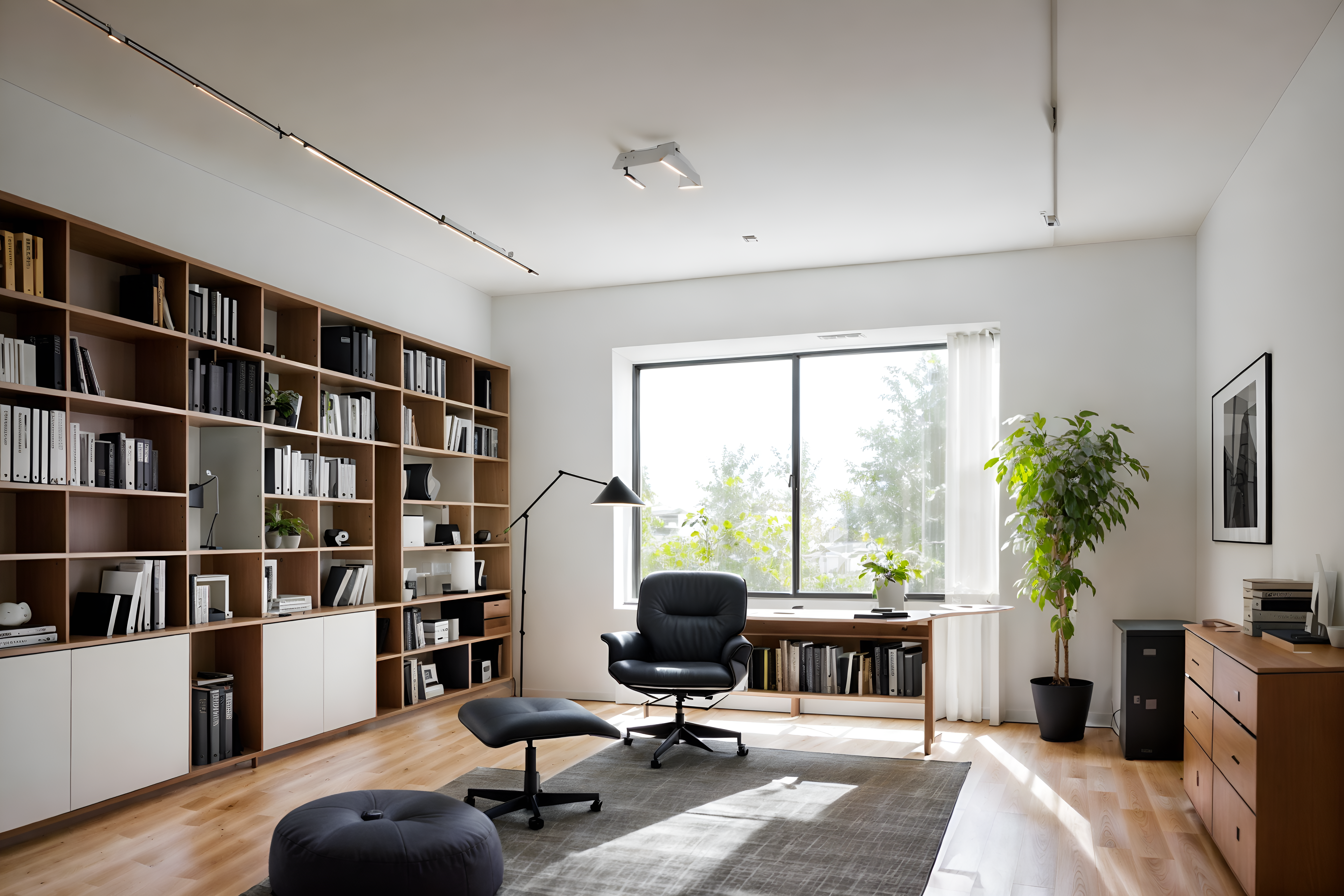 photo from pinterest of minimalist-style interior designed (study room interior) with bookshelves and plant and writing desk and office chair and lounge chair and cabinets and desk lamp and bookshelves. . with a monochromatic palette with colour used as an accent and lots of light and focus on the shape, colour and texture of just a few of essential elements and functional furniture and clean lines and an open floor plan and a monochromatic palette with colour used as an accent. . cinematic photo, highly detailed, cinematic lighting, ultra-detailed, ultrarealistic, photorealism, 8k. trending on pinterest. minimalist interior design style. masterpiece, cinematic light, ultrarealistic+, photorealistic+, 8k, raw photo, realistic, sharp focus on eyes, (symmetrical eyes), (intact eyes), hyperrealistic, highest quality, best quality, , highly detailed, masterpiece, best quality, extremely detailed 8k wallpaper, masterpiece, best quality, ultra-detailed, best shadow, detailed background, detailed face, detailed eyes, high contrast, best illumination, detailed face, dulux, caustic, dynamic angle, detailed glow. dramatic lighting. highly detailed, insanely detailed hair, symmetrical, intricate details, professionally retouched, 8k high definition. strong bokeh. award winning photo.