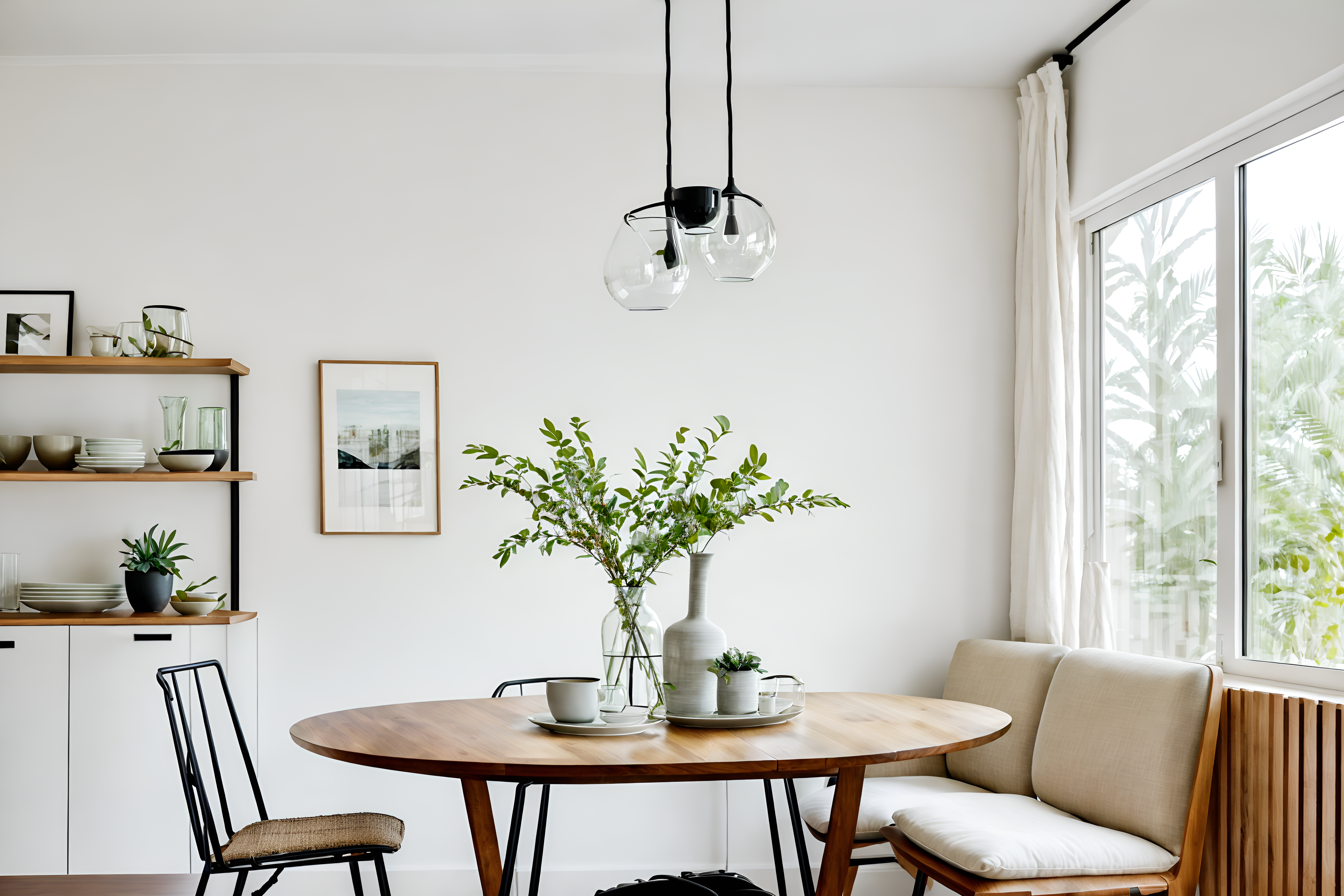 photo from pinterest of modern-style interior designed (dining room interior) with plant and dining table and bookshelves and vase and dining table chairs and table cloth and plates, cutlery and glasses on dining table and painting or photo on wall. . with open and natural lighting and neutral walls and textures and practicality and functionality and simple, clean lines and simplistic furniture and natural materials and elements and open and natural lighting. . cinematic photo, highly detailed, cinematic lighting, ultra-detailed, ultrarealistic, photorealism, 8k. trending on pinterest. modern interior design style. masterpiece, cinematic light, ultrarealistic+, photorealistic+, 8k, raw photo, realistic, sharp focus on eyes, (symmetrical eyes), (intact eyes), hyperrealistic, highest quality, best quality, , highly detailed, masterpiece, best quality, extremely detailed 8k wallpaper, masterpiece, best quality, ultra-detailed, best shadow, detailed background, detailed face, detailed eyes, high contrast, best illumination, detailed face, dulux, caustic, dynamic angle, detailed glow. dramatic lighting. highly detailed, insanely detailed hair, symmetrical, intricate details, professionally retouched, 8k high definition. strong bokeh. award winning photo.