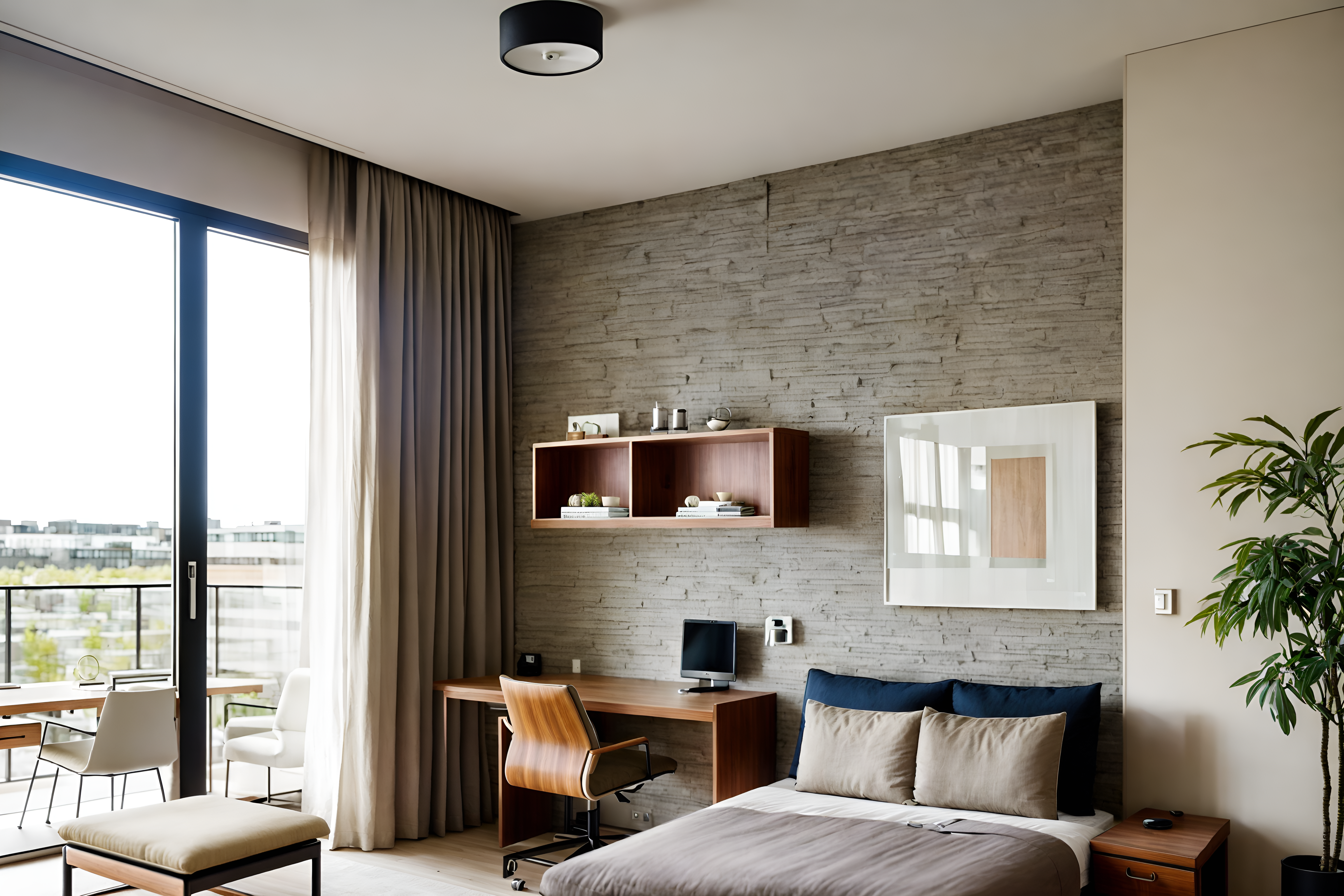 photo from pinterest of modern-style interior designed (hotel room interior) with storage bench or ottoman and plant and working desk with desk chair and accent chair and hotel bathroom and bedside table or night stand and bed and night light. . with open and natural lighting and practicality and functionality and neutral walls and textures and natural materials and elements and simple, clean lines and simplistic furniture and open and natural lighting. . cinematic photo, highly detailed, cinematic lighting, ultra-detailed, ultrarealistic, photorealism, 8k. trending on pinterest. modern interior design style. masterpiece, cinematic light, ultrarealistic+, photorealistic+, 8k, raw photo, realistic, sharp focus on eyes, (symmetrical eyes), (intact eyes), hyperrealistic, highest quality, best quality, , highly detailed, masterpiece, best quality, extremely detailed 8k wallpaper, masterpiece, best quality, ultra-detailed, best shadow, detailed background, detailed face, detailed eyes, high contrast, best illumination, detailed face, dulux, caustic, dynamic angle, detailed glow. dramatic lighting. highly detailed, insanely detailed hair, symmetrical, intricate details, professionally retouched, 8k high definition. strong bokeh. award winning photo.