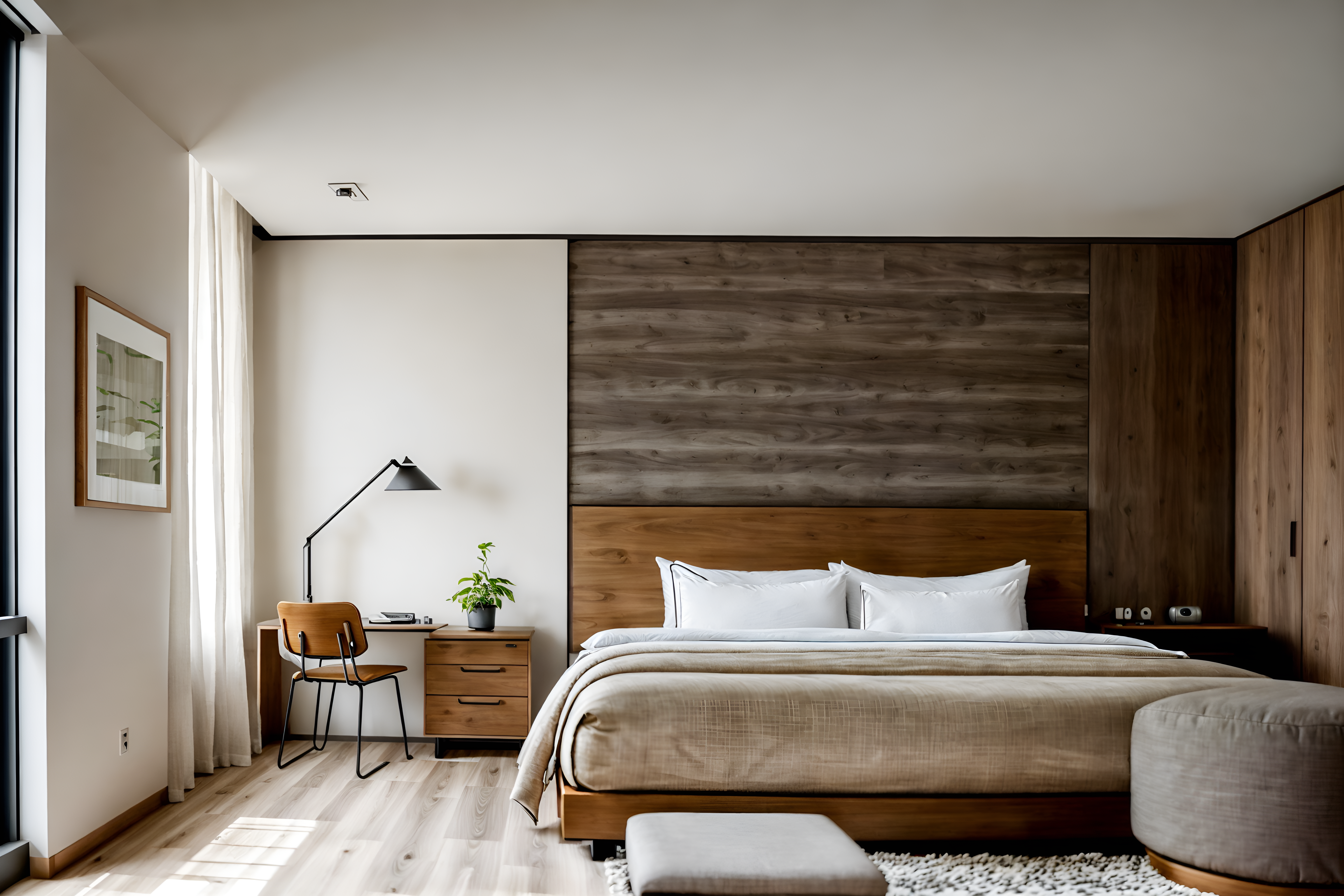 photo from pinterest of modern-style interior designed (hotel room interior) with storage bench or ottoman and plant and working desk with desk chair and accent chair and hotel bathroom and bedside table or night stand and bed and night light. . with open and natural lighting and practicality and functionality and neutral walls and textures and natural materials and elements and simple, clean lines and simplistic furniture and open and natural lighting. . cinematic photo, highly detailed, cinematic lighting, ultra-detailed, ultrarealistic, photorealism, 8k. trending on pinterest. modern interior design style. masterpiece, cinematic light, ultrarealistic+, photorealistic+, 8k, raw photo, realistic, sharp focus on eyes, (symmetrical eyes), (intact eyes), hyperrealistic, highest quality, best quality, , highly detailed, masterpiece, best quality, extremely detailed 8k wallpaper, masterpiece, best quality, ultra-detailed, best shadow, detailed background, detailed face, detailed eyes, high contrast, best illumination, detailed face, dulux, caustic, dynamic angle, detailed glow. dramatic lighting. highly detailed, insanely detailed hair, symmetrical, intricate details, professionally retouched, 8k high definition. strong bokeh. award winning photo.