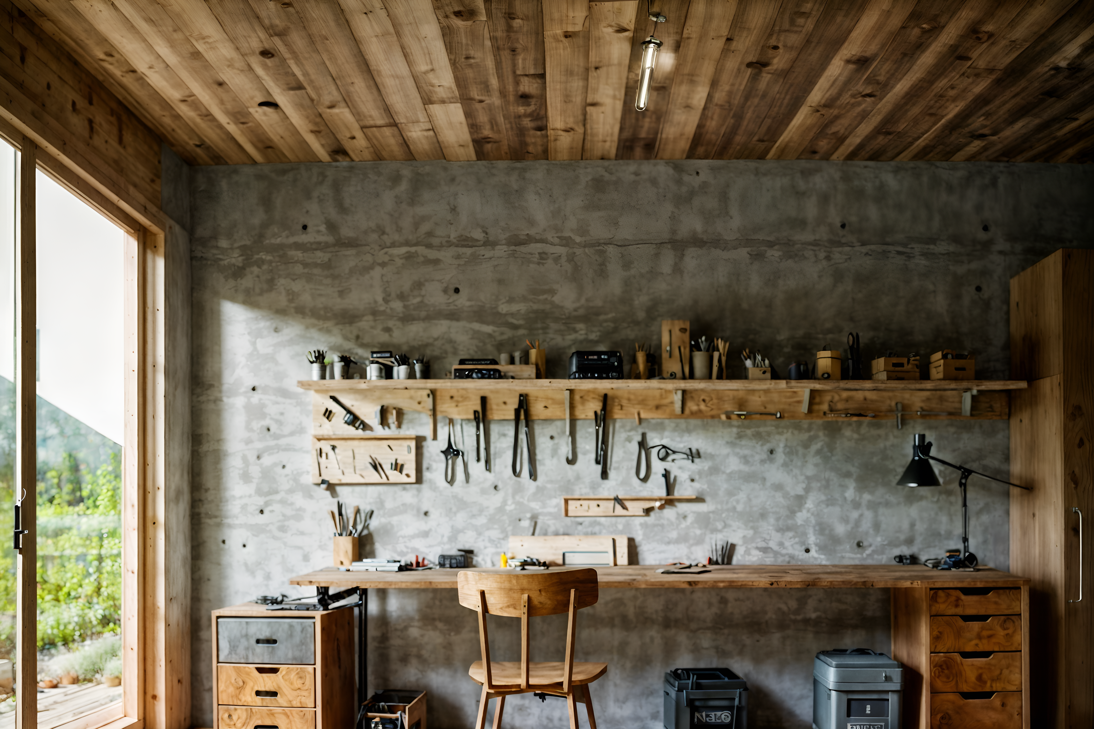 photo from pinterest of modern-style interior designed (workshop interior) with tool wall and messy and wooden workbench and tool wall. . with natural materials and elements and simple, clean lines and simplistic furniture and neutral walls and textures and practicality and functionality and open and natural lighting and natural materials and elements. . cinematic photo, highly detailed, cinematic lighting, ultra-detailed, ultrarealistic, photorealism, 8k. trending on pinterest. modern interior design style. masterpiece, cinematic light, ultrarealistic+, photorealistic+, 8k, raw photo, realistic, sharp focus on eyes, (symmetrical eyes), (intact eyes), hyperrealistic, highest quality, best quality, , highly detailed, masterpiece, best quality, extremely detailed 8k wallpaper, masterpiece, best quality, ultra-detailed, best shadow, detailed background, detailed face, detailed eyes, high contrast, best illumination, detailed face, dulux, caustic, dynamic angle, detailed glow. dramatic lighting. highly detailed, insanely detailed hair, symmetrical, intricate details, professionally retouched, 8k high definition. strong bokeh. award winning photo.
