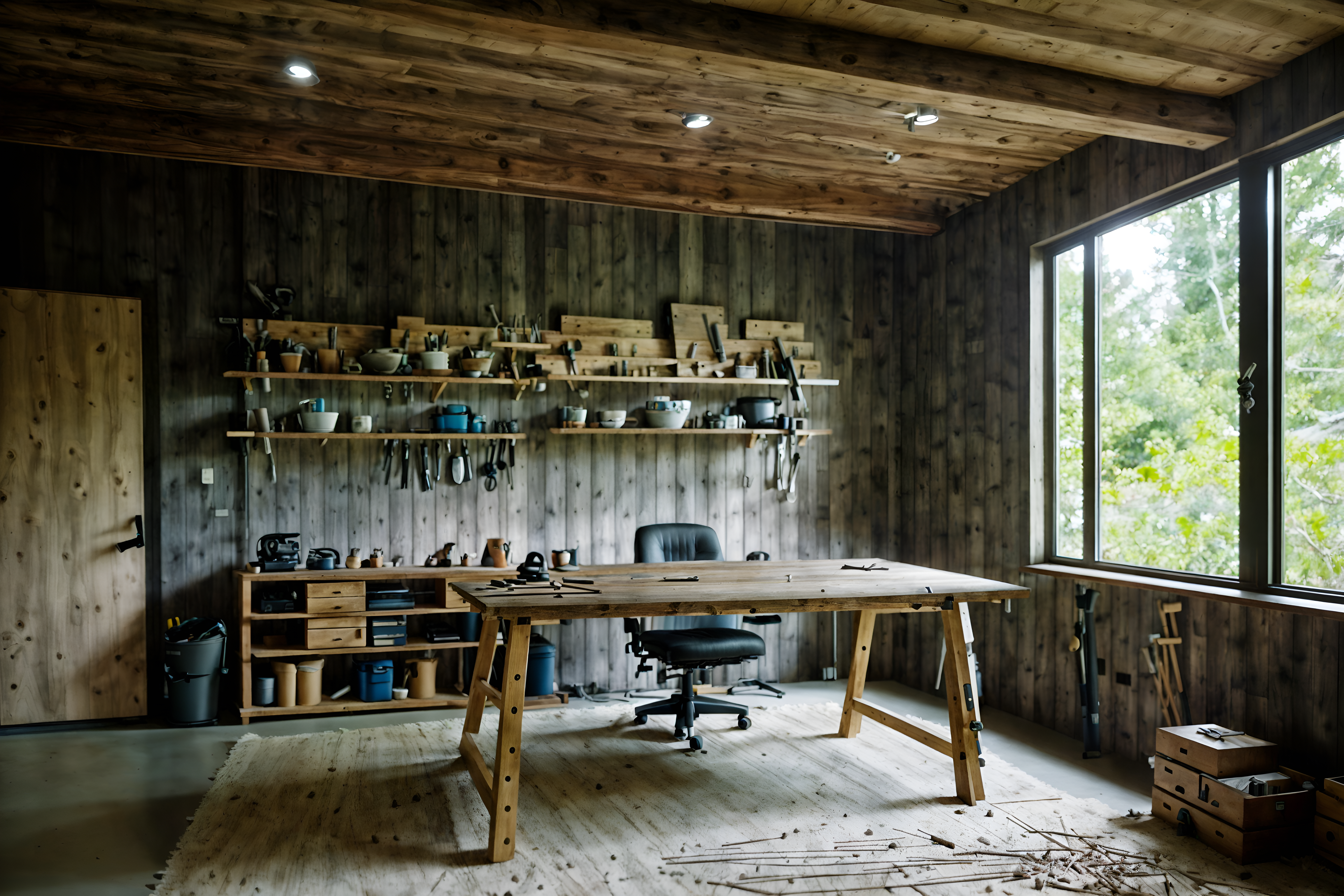photo from pinterest of modern-style interior designed (workshop interior) with tool wall and messy and wooden workbench and tool wall. . with natural materials and elements and simple, clean lines and simplistic furniture and neutral walls and textures and practicality and functionality and open and natural lighting and natural materials and elements. . cinematic photo, highly detailed, cinematic lighting, ultra-detailed, ultrarealistic, photorealism, 8k. trending on pinterest. modern interior design style. masterpiece, cinematic light, ultrarealistic+, photorealistic+, 8k, raw photo, realistic, sharp focus on eyes, (symmetrical eyes), (intact eyes), hyperrealistic, highest quality, best quality, , highly detailed, masterpiece, best quality, extremely detailed 8k wallpaper, masterpiece, best quality, ultra-detailed, best shadow, detailed background, detailed face, detailed eyes, high contrast, best illumination, detailed face, dulux, caustic, dynamic angle, detailed glow. dramatic lighting. highly detailed, insanely detailed hair, symmetrical, intricate details, professionally retouched, 8k high definition. strong bokeh. award winning photo.