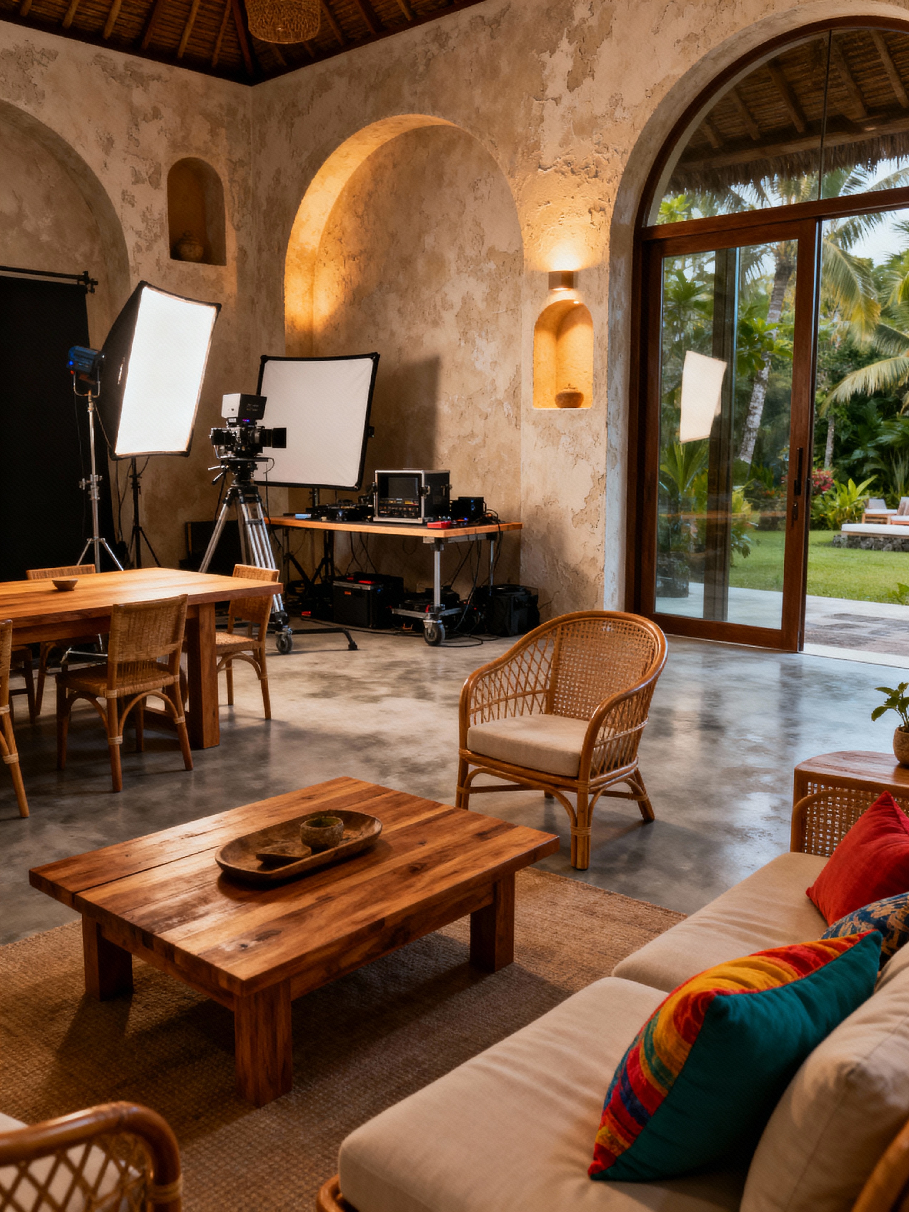 movie set with bali style with movie set and equipment table and film set interior and reflector panels and cinematic lighting and film lighting equipment and film production set and professional lighting equipment. . with wooden coffee and dining tables and rattan chairs and decor and textured plaster or stucco finish and microcement floors and conversation pit with pillows and arched walls and niches and warm ambient lighting and indoor-outdoor flow with glass doors