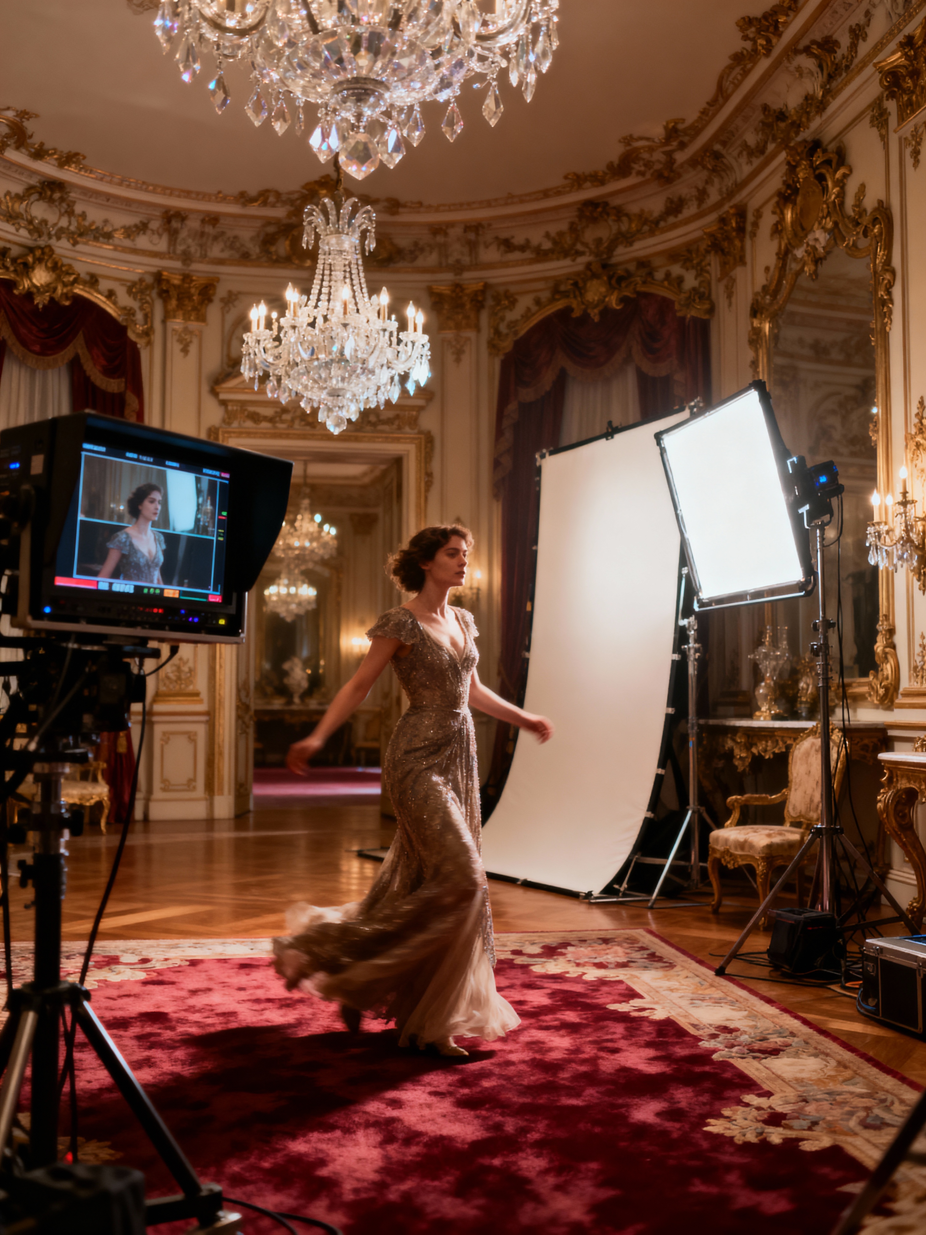 movie set with baroque style with film set interior and film set interior and movie set and film production set and movie set and reflector panels and director monitor and film set interior. . with grandeur and sensuous richness and heavy moldings and emotional exuberance and crystal and glass accents and movement and expensive and plush flooring and elaborate ornamentation