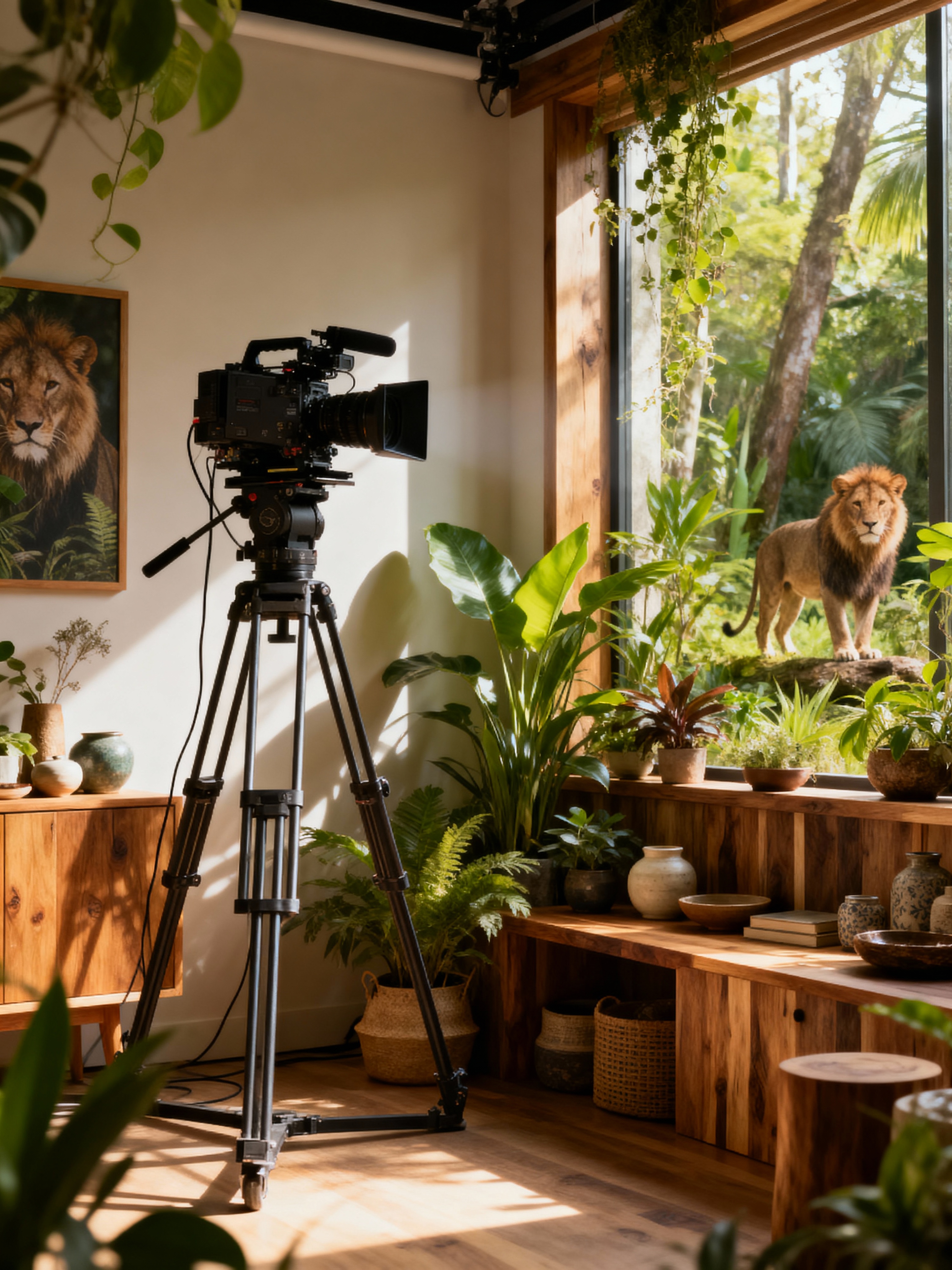 movie set with biophilic style with professional movie set and film lighting equipment and professional movie set and cinematic lighting and camera on tripod and film set interior and film set interior and professional lighting equipment. . with plants and wood materials and features of the natural world and ceramic materials and plants and images of animals and natural environment and sunlight