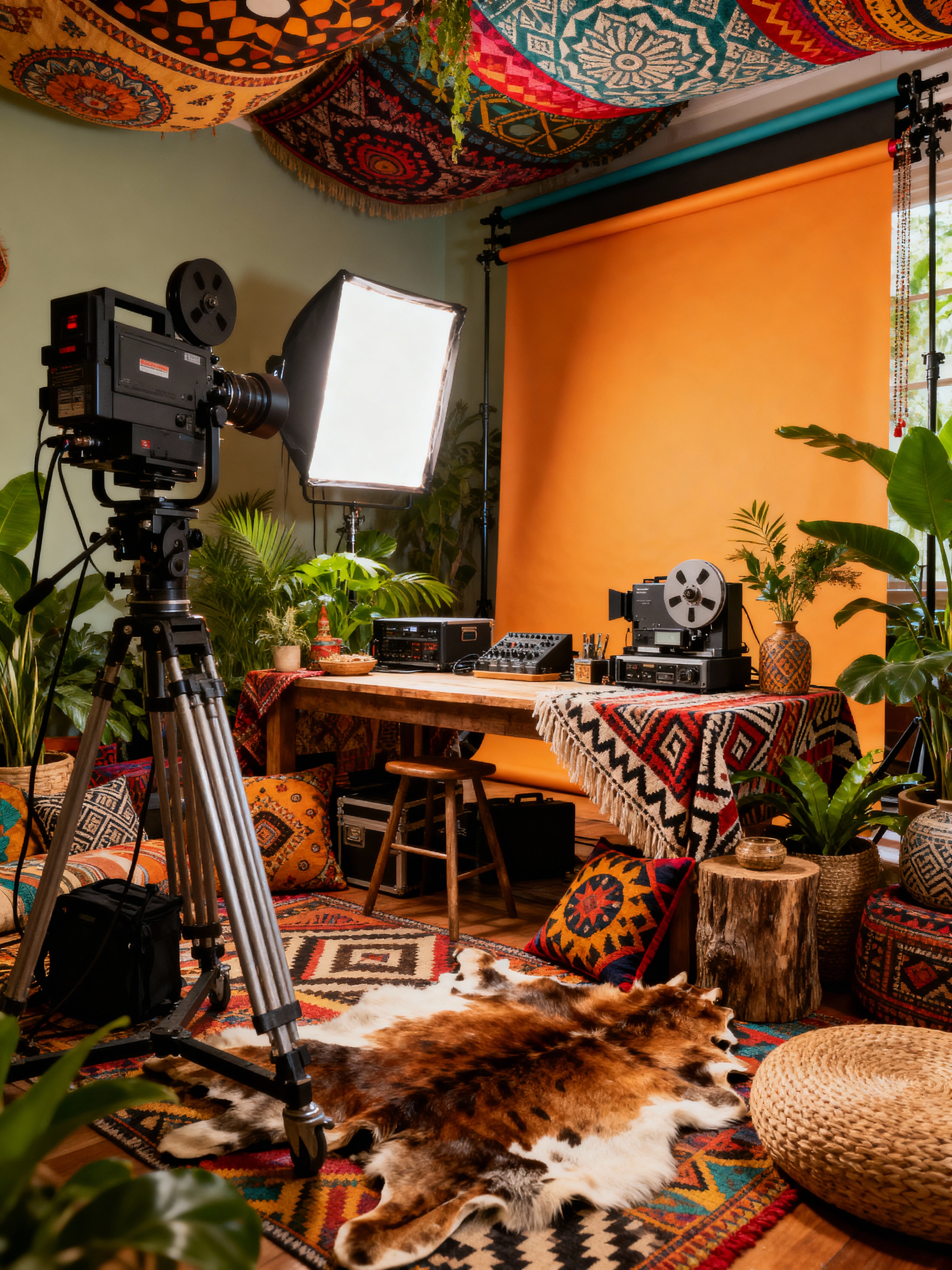 movie set with bohemian style with film lighting equipment and professional movie set and professional movie set and cinematic lighting and movie backdrop and film set interior and equipment table and movie set. . with animal hides and mixed patterns and playful textures and bold patterns and lush green nature and a lack of structure and natural materials and playful patterns